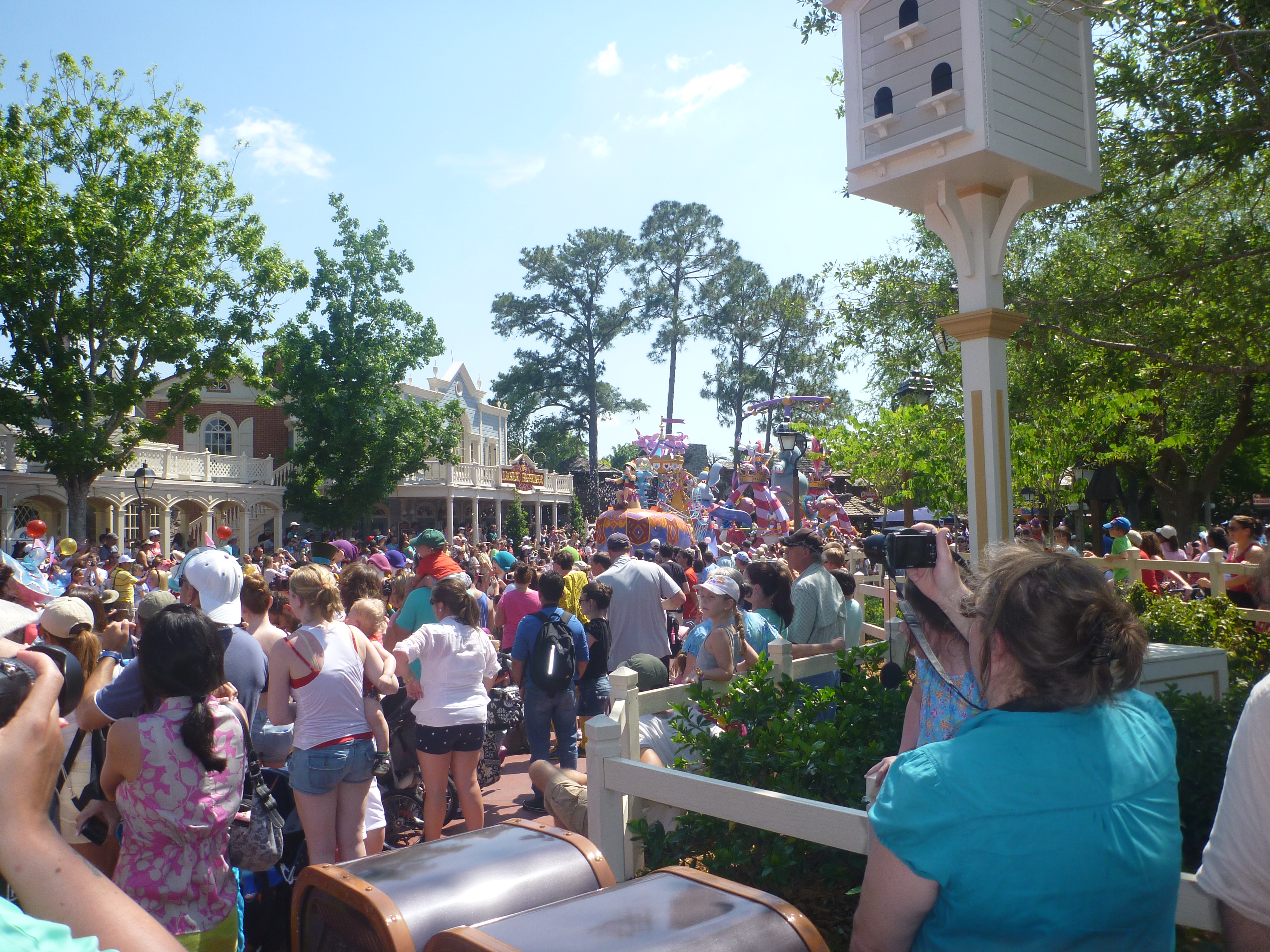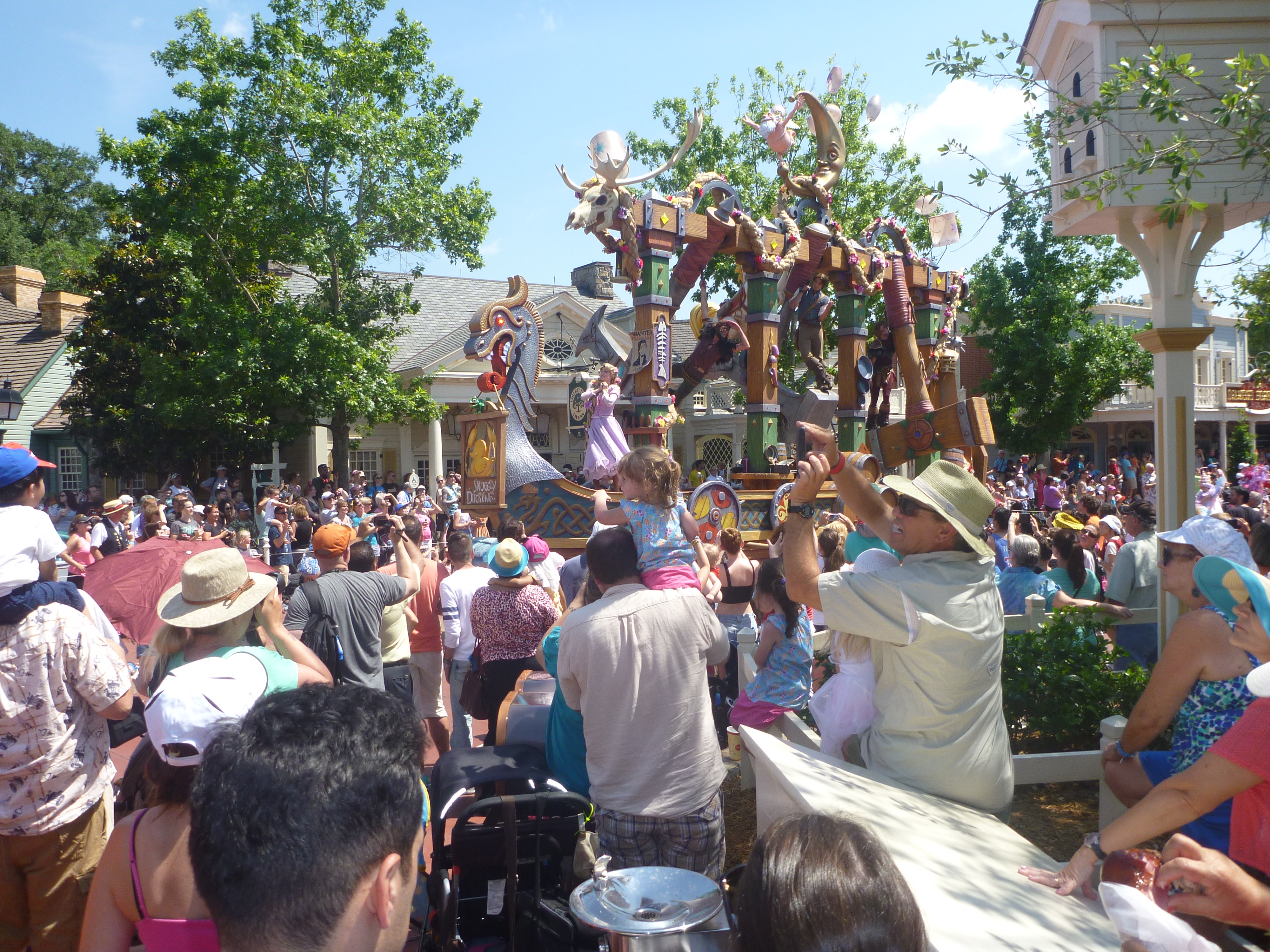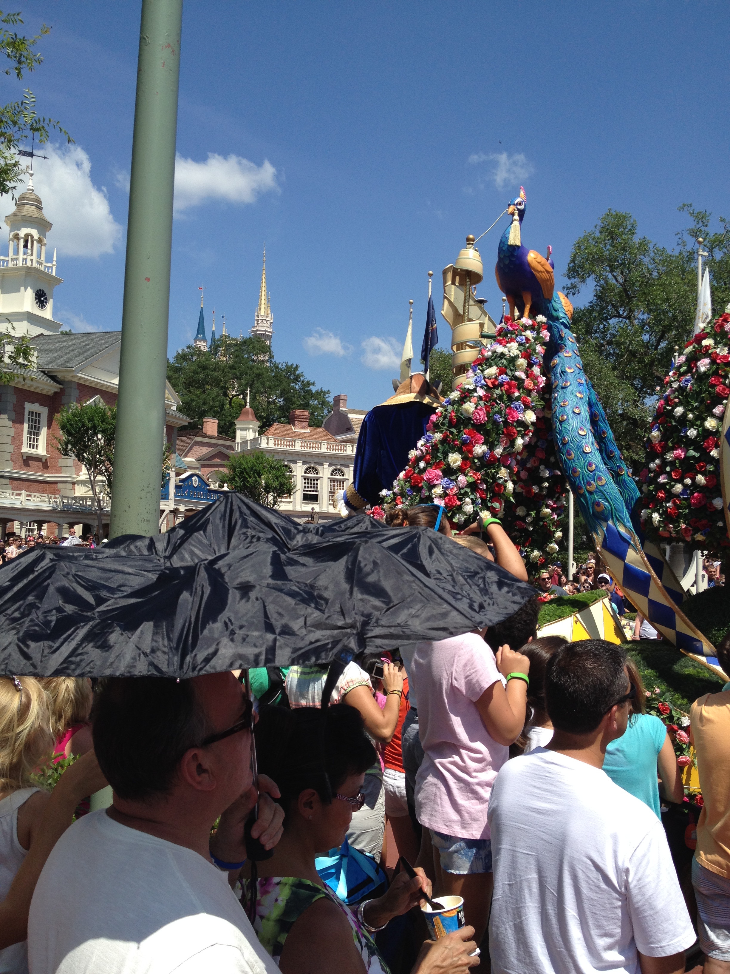 Na saída deste castelo vimos que alguns funcionários do parque estavam pedindo para as pessoas não circularem no centro da rua. Esperamos porque ia começar mais uma parada. Durante a parada eles marcam rapidamente no chão uma fita branca onde não podemos ultrapassar e nem ficar em cima. Nisso eles são bem rígidos, se não respeitar eles falam na hora para irmos para trás.