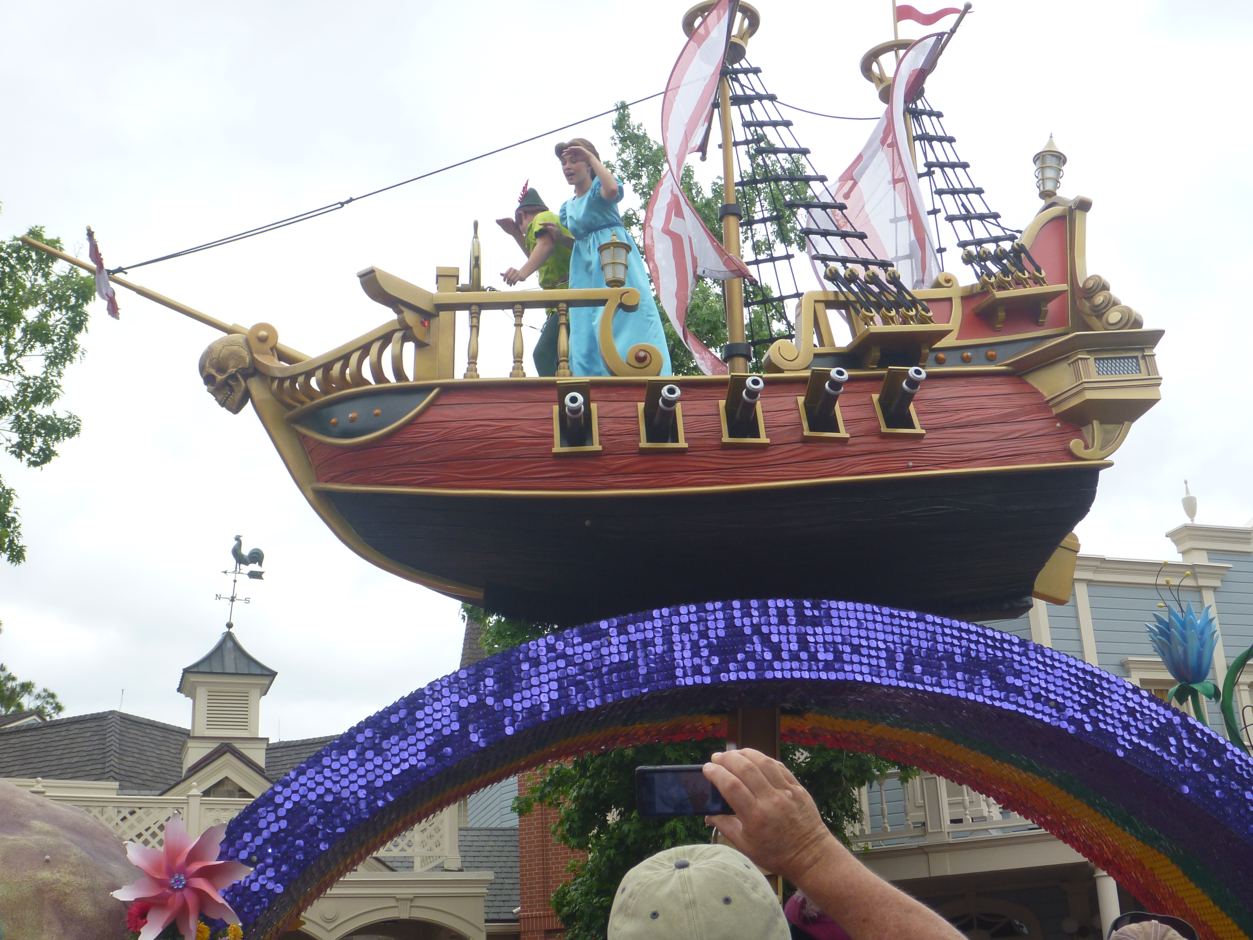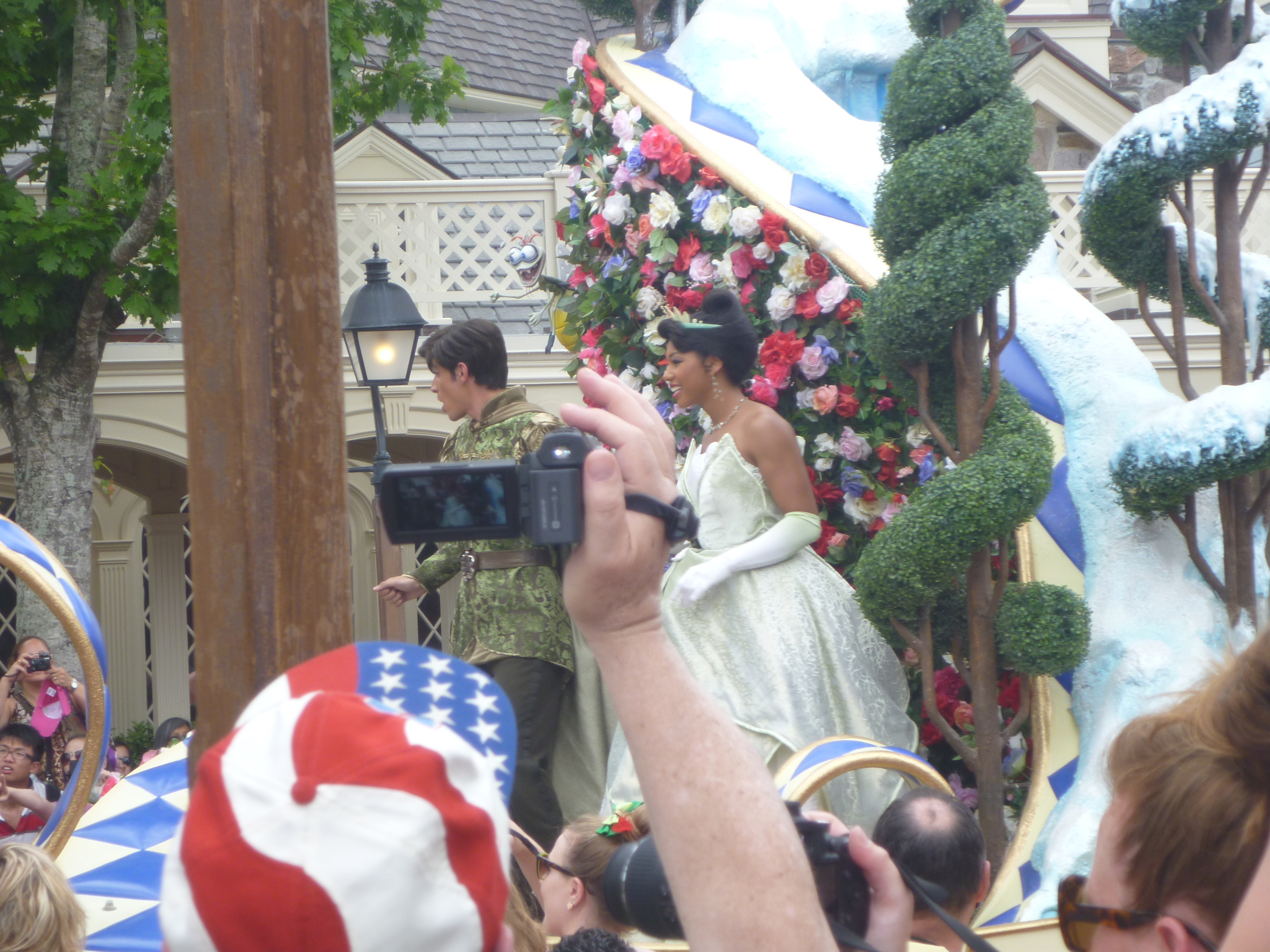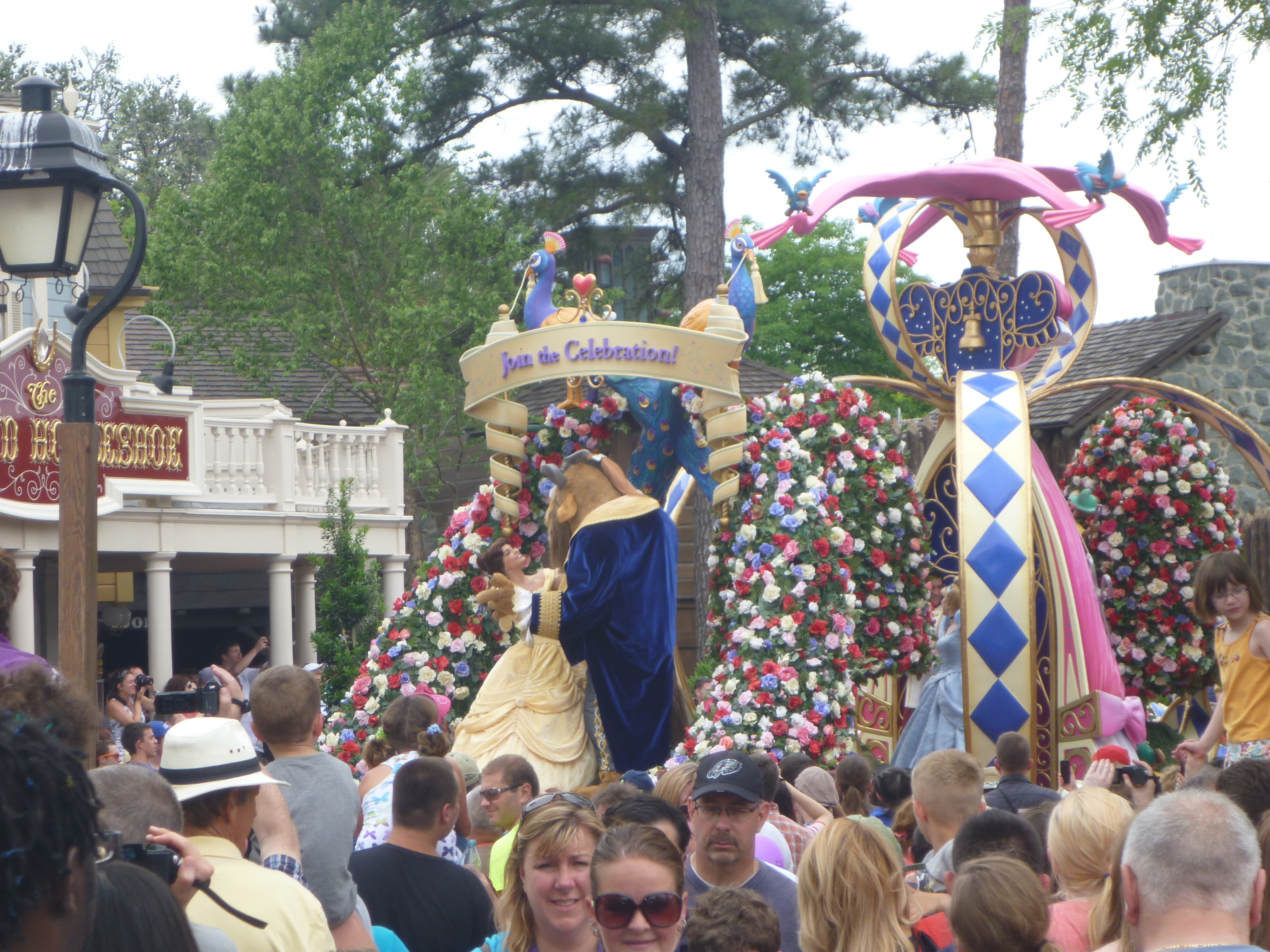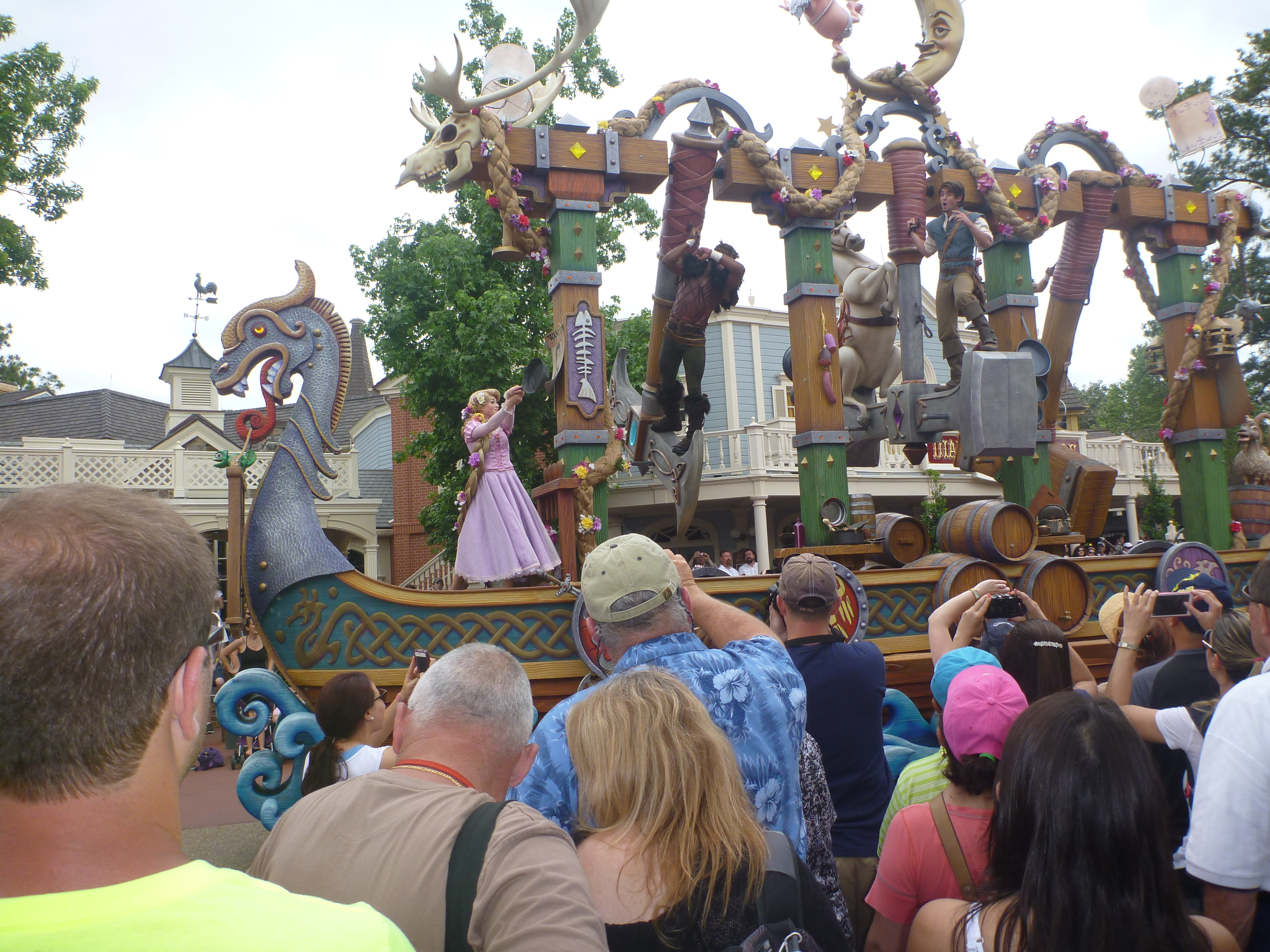 Na saída deste castelo vimos que alguns funcionários do parque estavam pedindo para as pessoas não circularem no centro da rua. Esperamos porque ia começar mais uma parada. Durante a parada eles marcam rapidamente no chão uma fita branca onde não podemos ultrapassar e nem ficar em cima. Nisso eles são bem rígidos, se não respeitar eles falam na hora para irmos para trás.