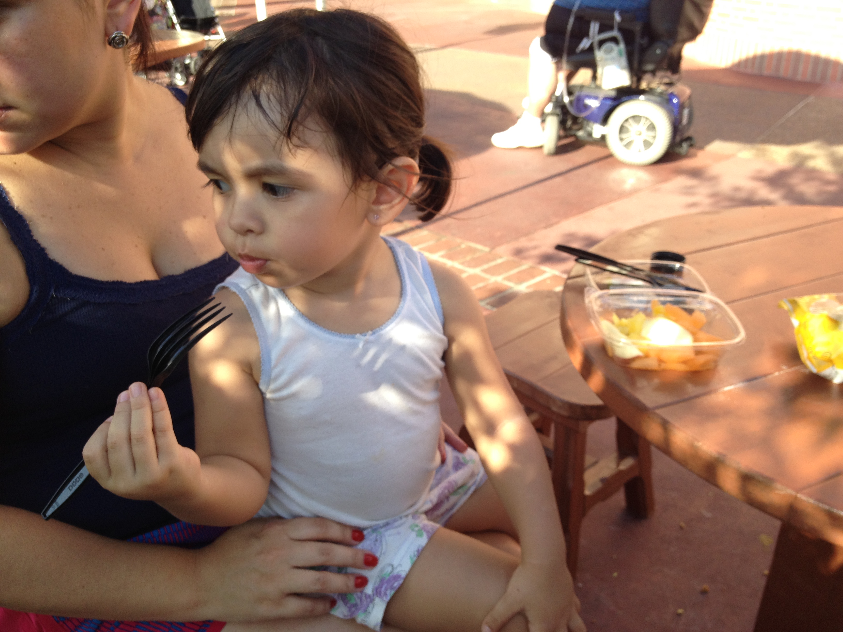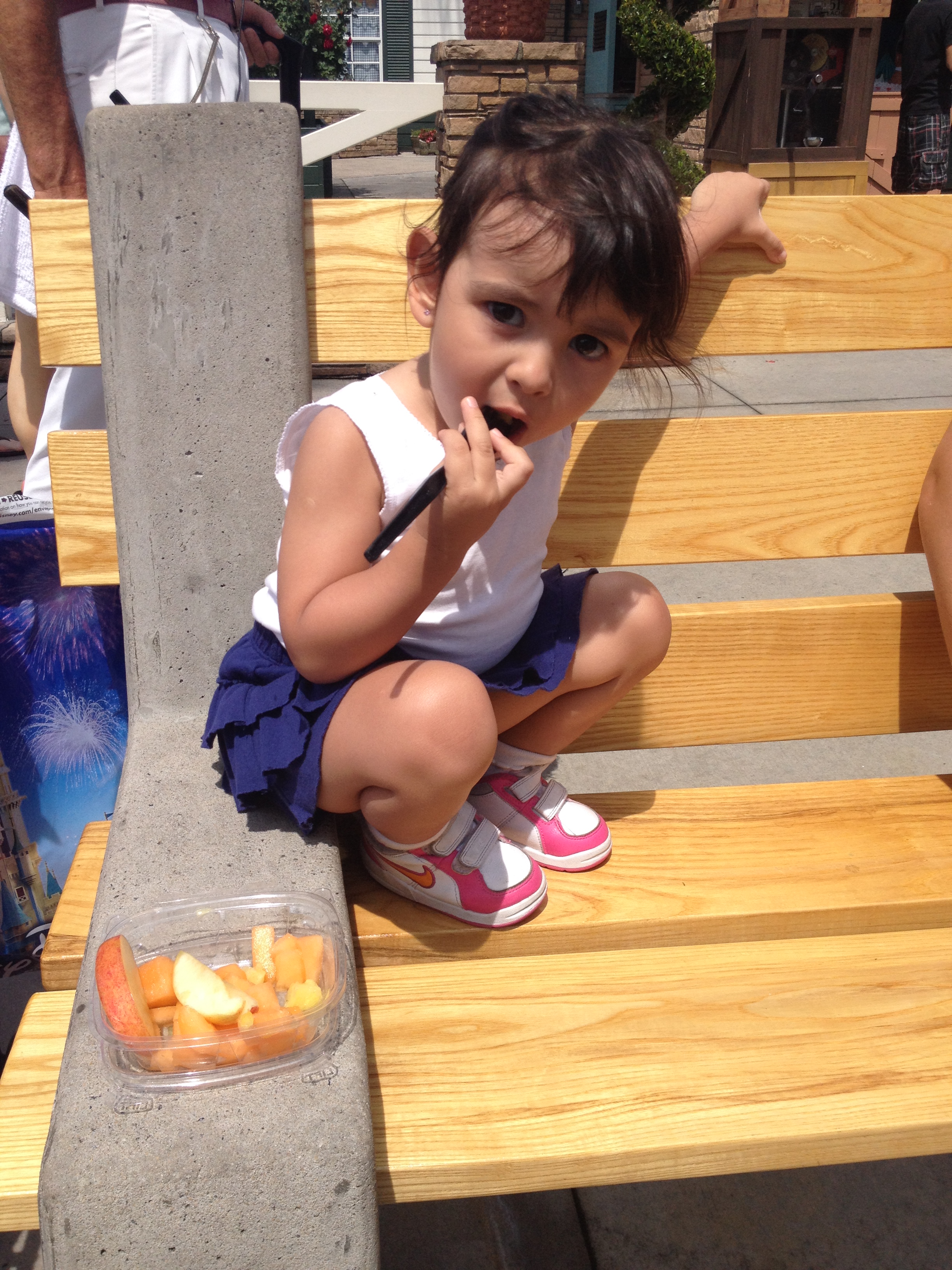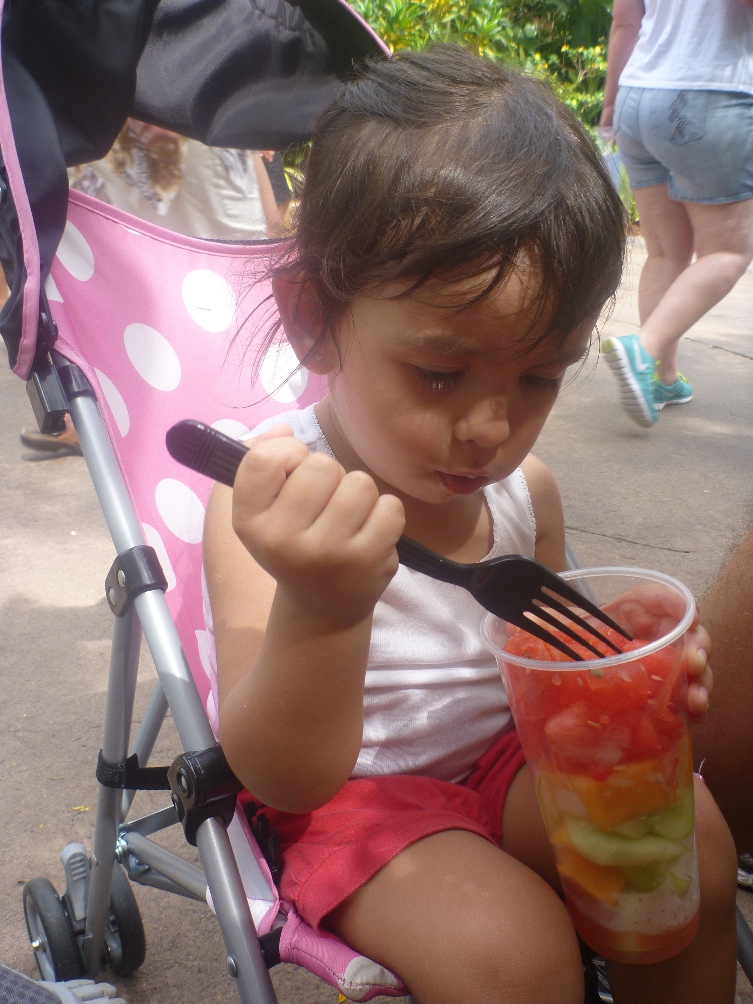 Aproveitamos para fazer uma parada com a Julia e compramos um pote de frutas sortidas cortadinhas. A Julia comeu mais da metade do copo e só queria repetir o abacaxi!