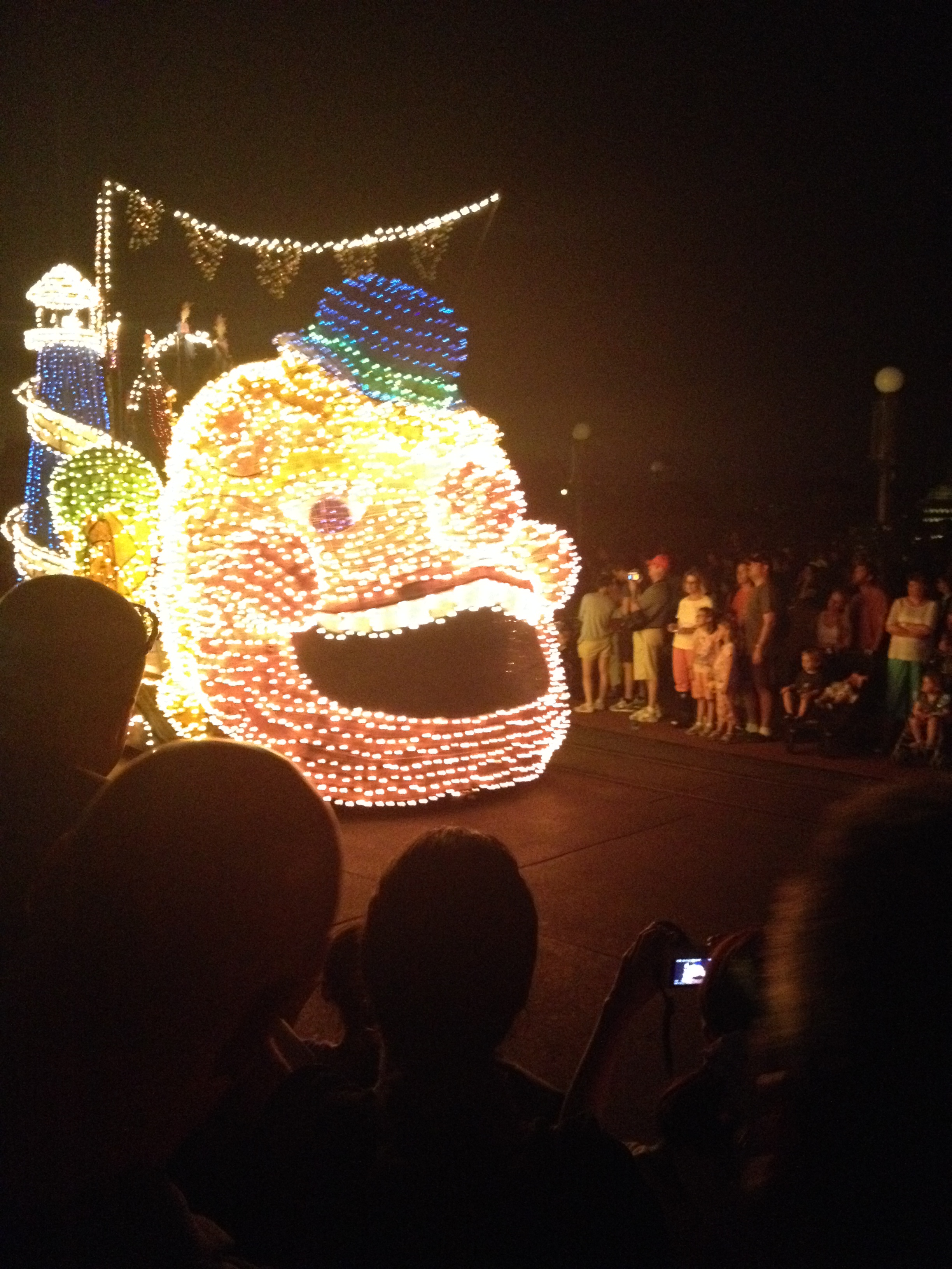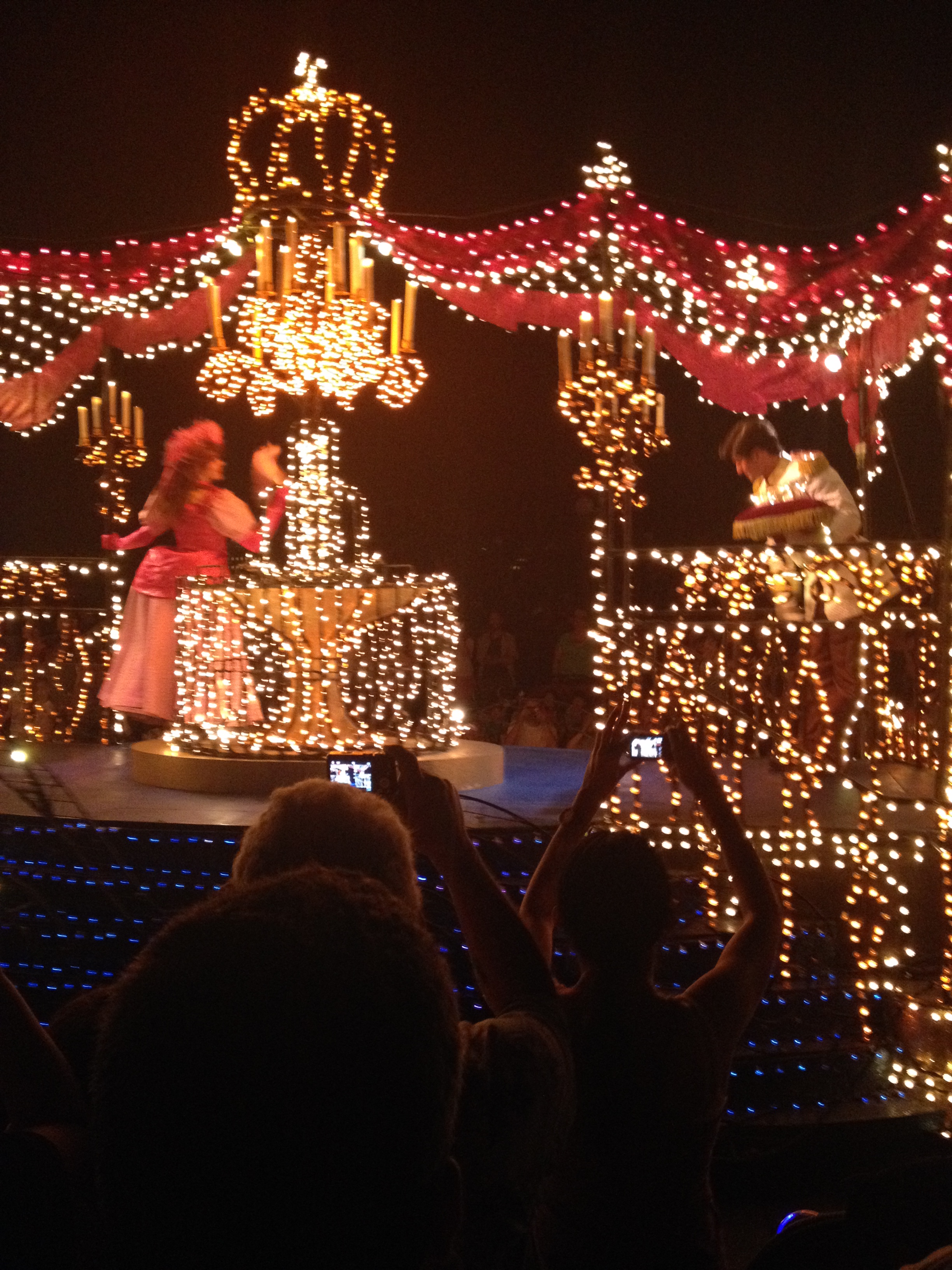 Antes da queima de fogos, teve a última parada com desfile, e foi muito longa e muito bonita. A Ju delirou!! Tudo iluminado, muito bonito mesmo.
