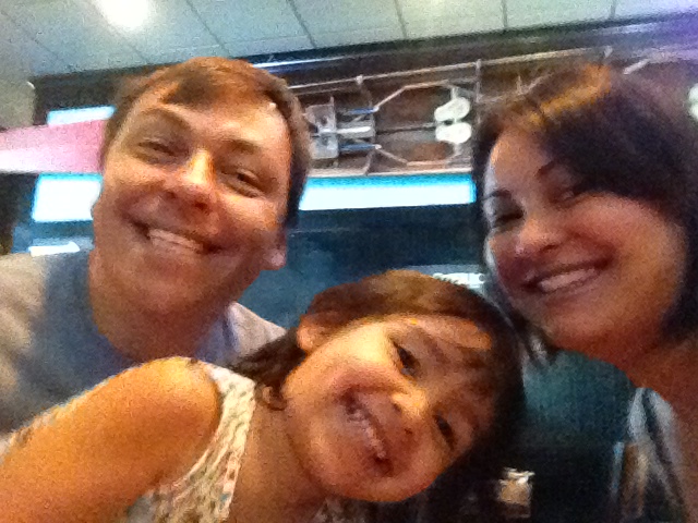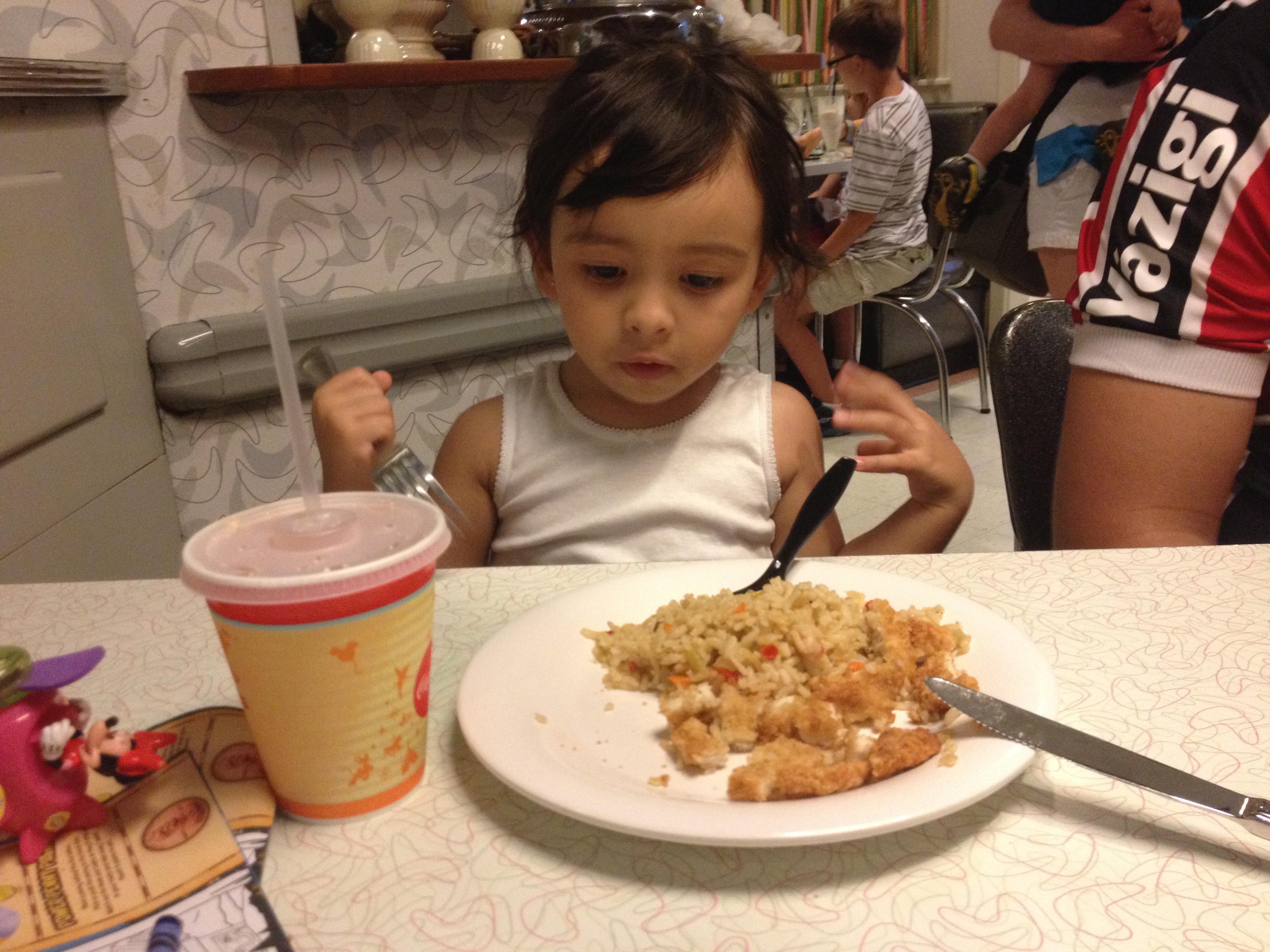 Almoçamos em um restaurante chamado “Chicken Now” enquanto chovia e compramos para a Julia um prato com macarrão, batata frita e frango frito. Ela comeu todo macarrão, um pouco de frango e batata. Já eu e o Thiago pegamos um hambúrguer de frango, batata frita e refrigerante. Nosso almoço saiu ontem cerca de $ 28,00.