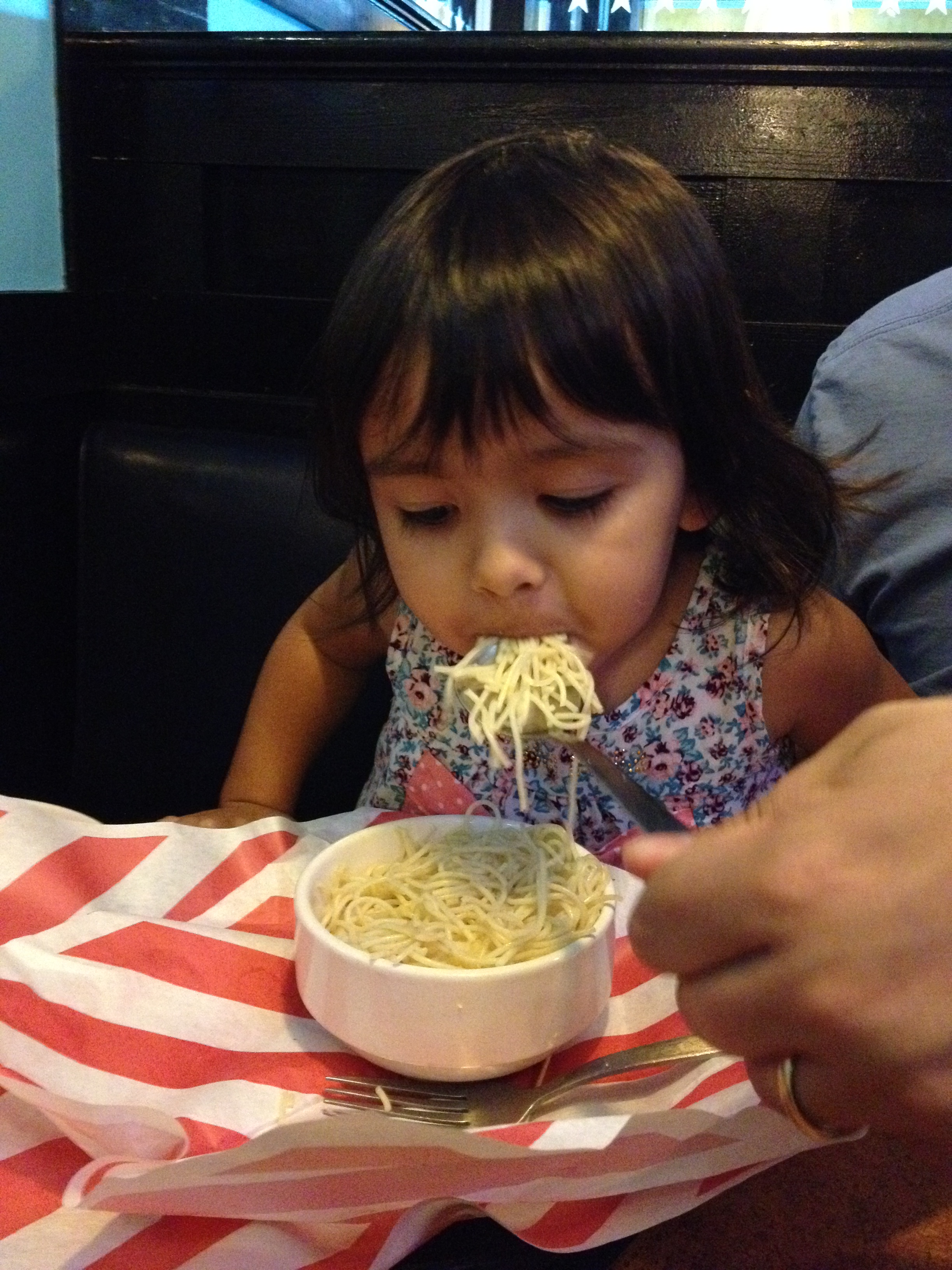 Escolhemos para a Julia um prato de macarrão sem molho, pra variar, com limonada e uva de sobremesa.