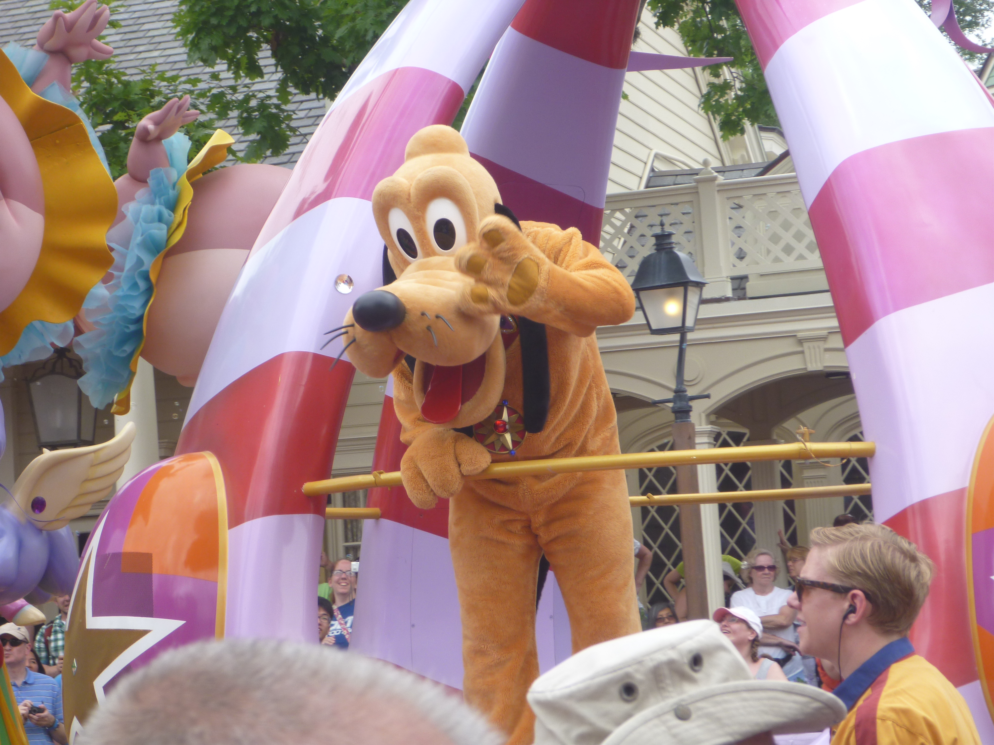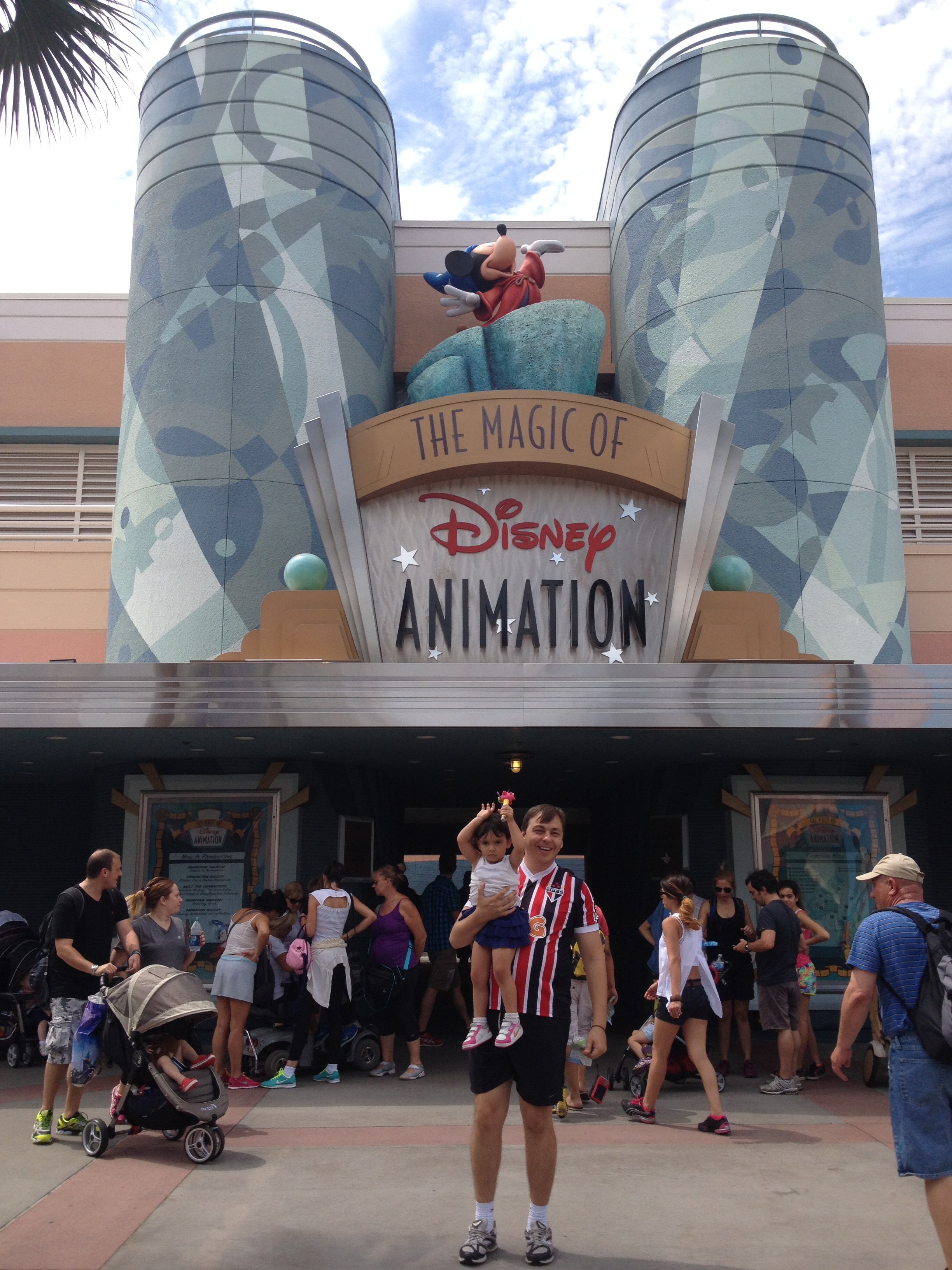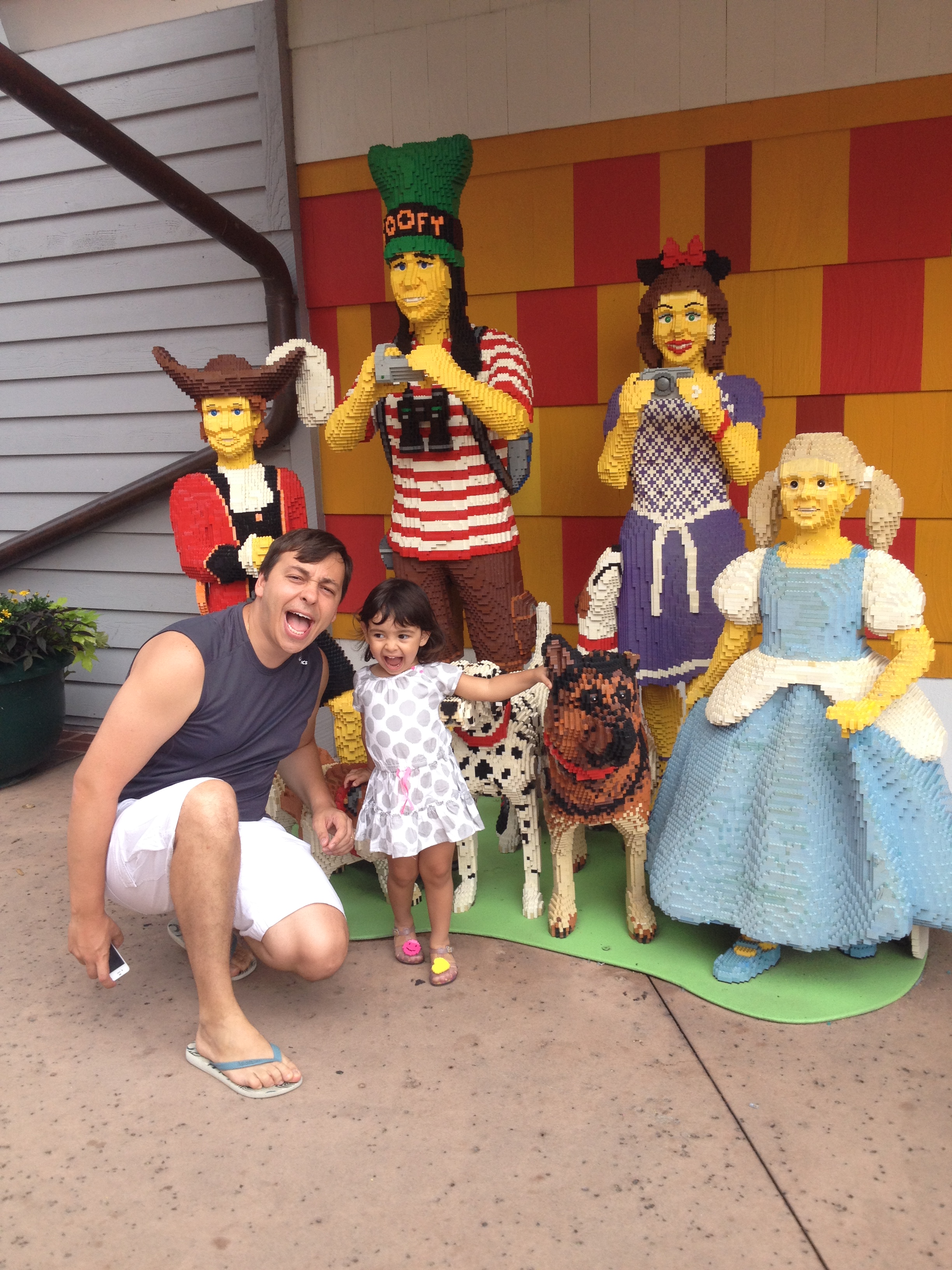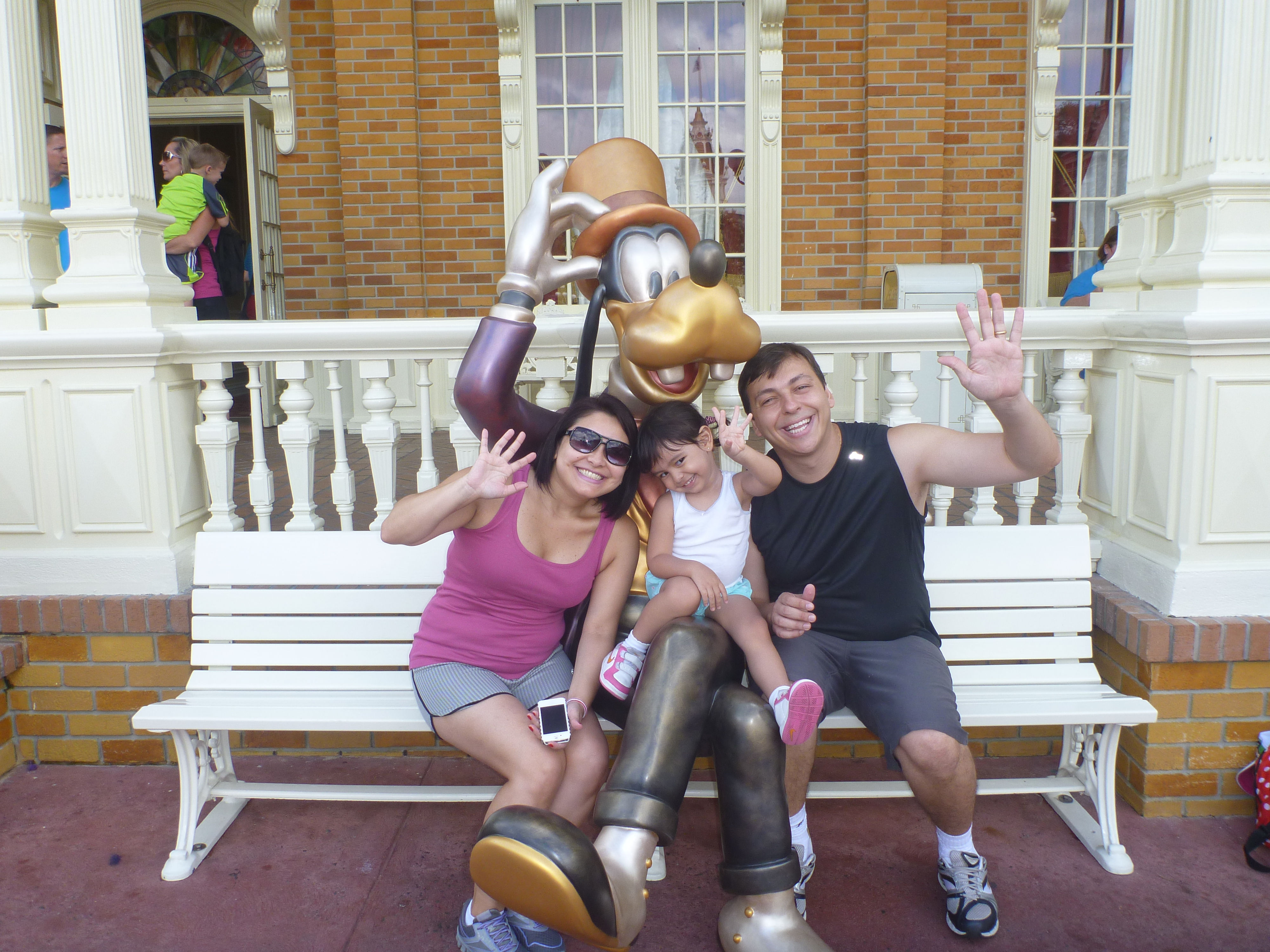 Ao entrar vimos o Pluto no jardim mas a fila estava grande e a Julia começou a dar os “pitis”dela. Acabamos desistindo da foto com o Pluto e sem saber os funcionários do parque pediram para subirmos na calçada e começou a passar a parada dos personagens. Esta parada foi dos Incríveis, Michey, Toy Story (este a Julia amou) e alguns outros personagens. Que legal!