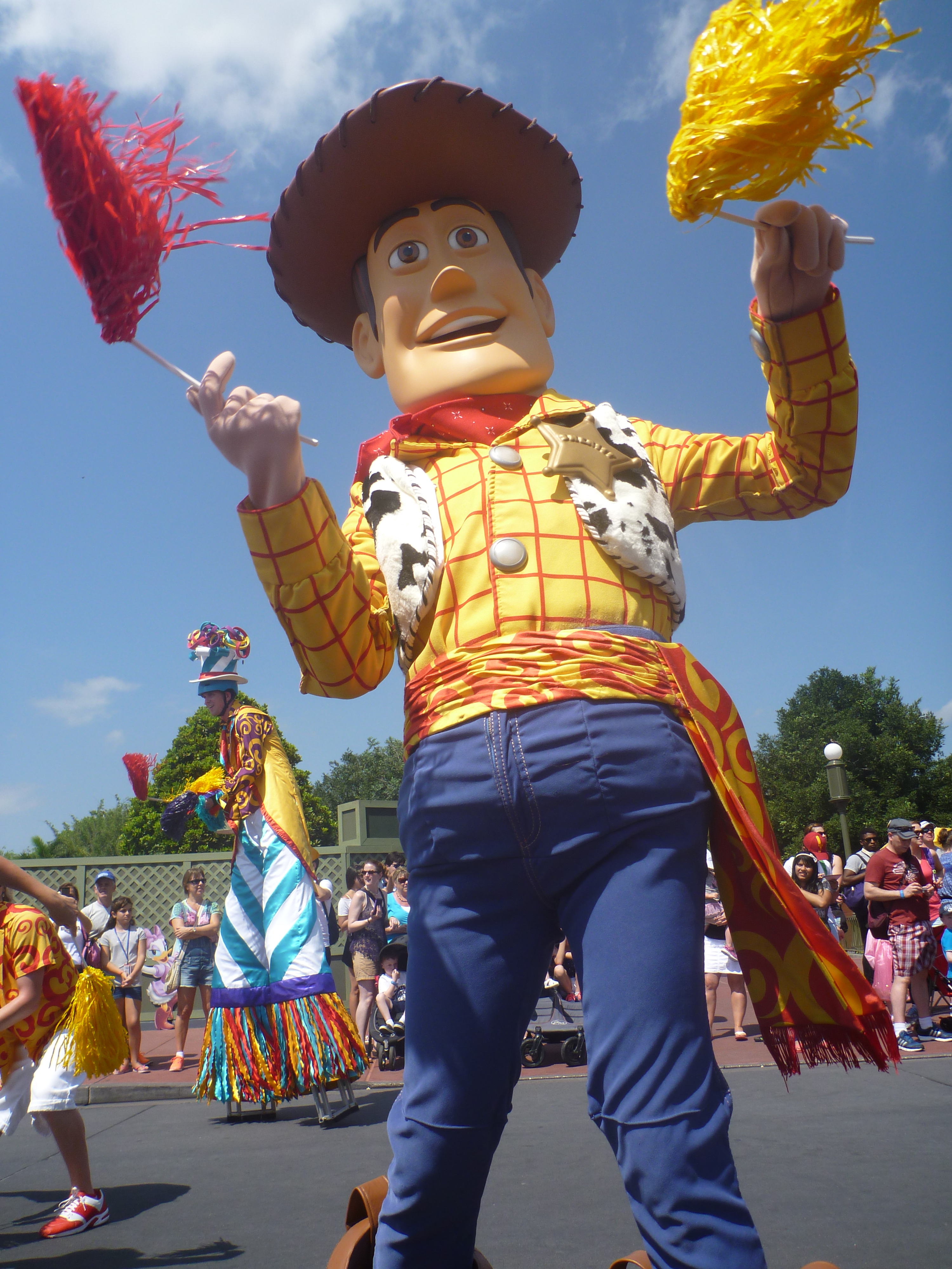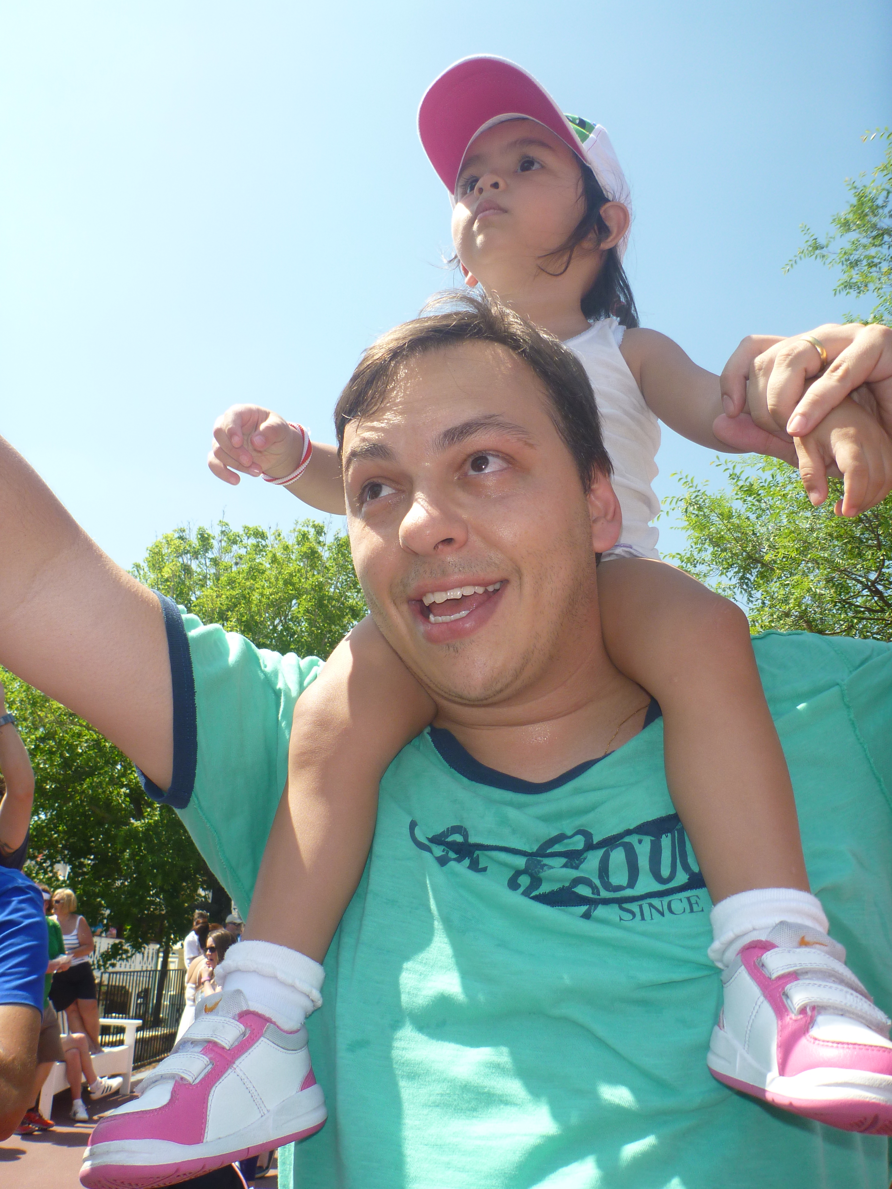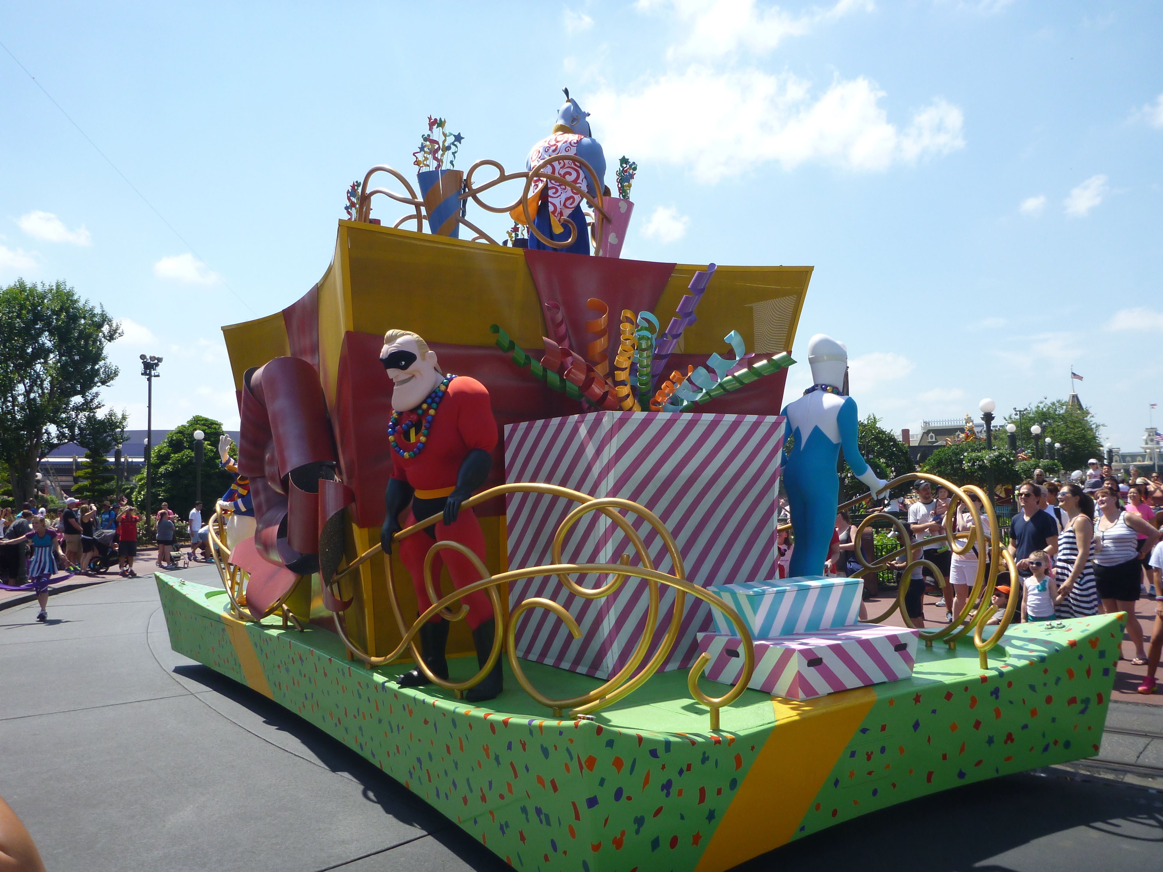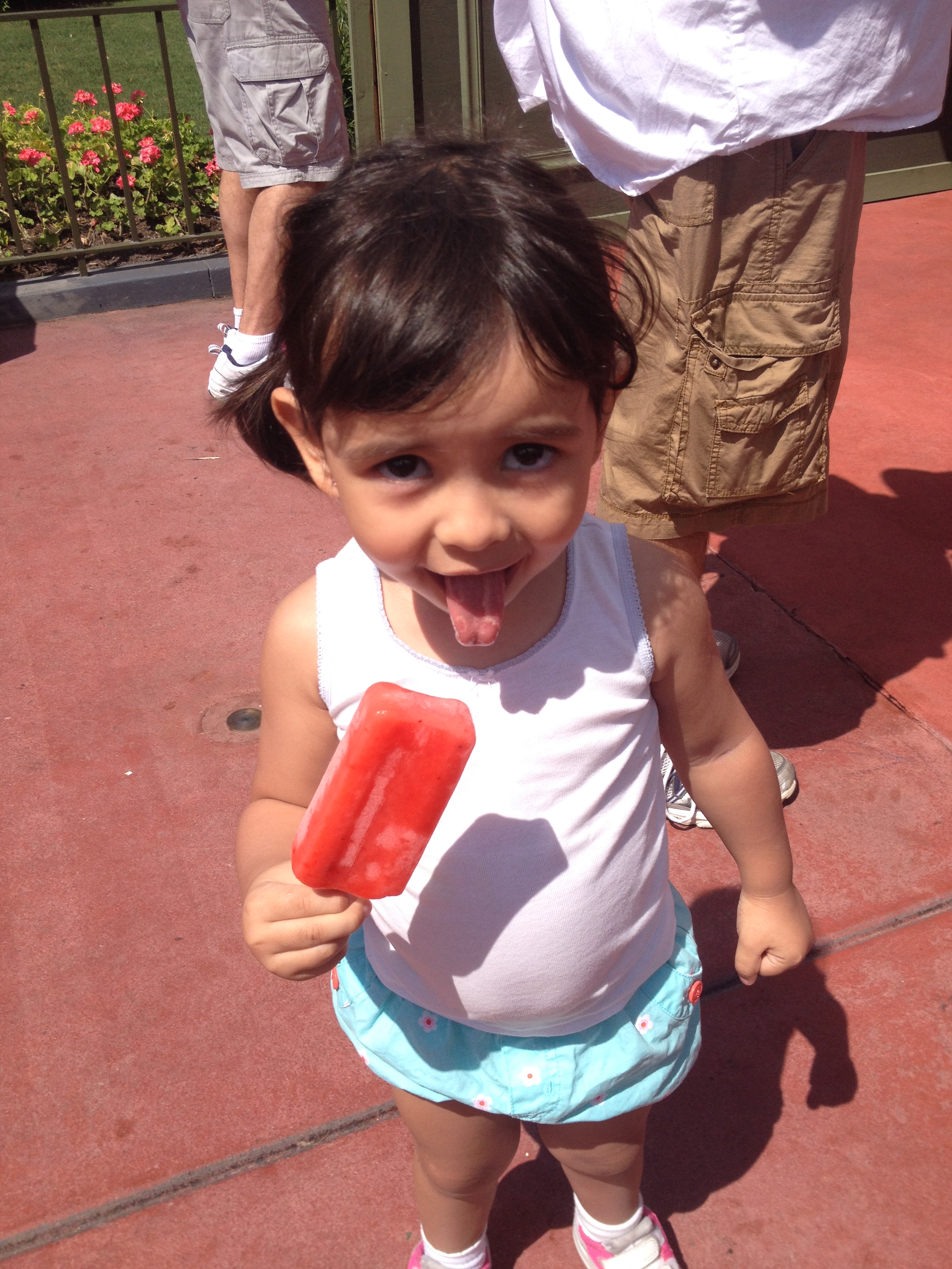 Ao entrar vimos o Pluto no jardim mas a fila estava grande e a Julia começou a dar os “pitis”dela. Acabamos desistindo da foto com o Pluto e sem saber os funcionários do parque pediram para subirmos na calçada e começou a passar a parada dos personagens. Esta parada foi dos Incríveis, Michey, Toy Story (este a Julia amou) e alguns outros personagens. Que legal!