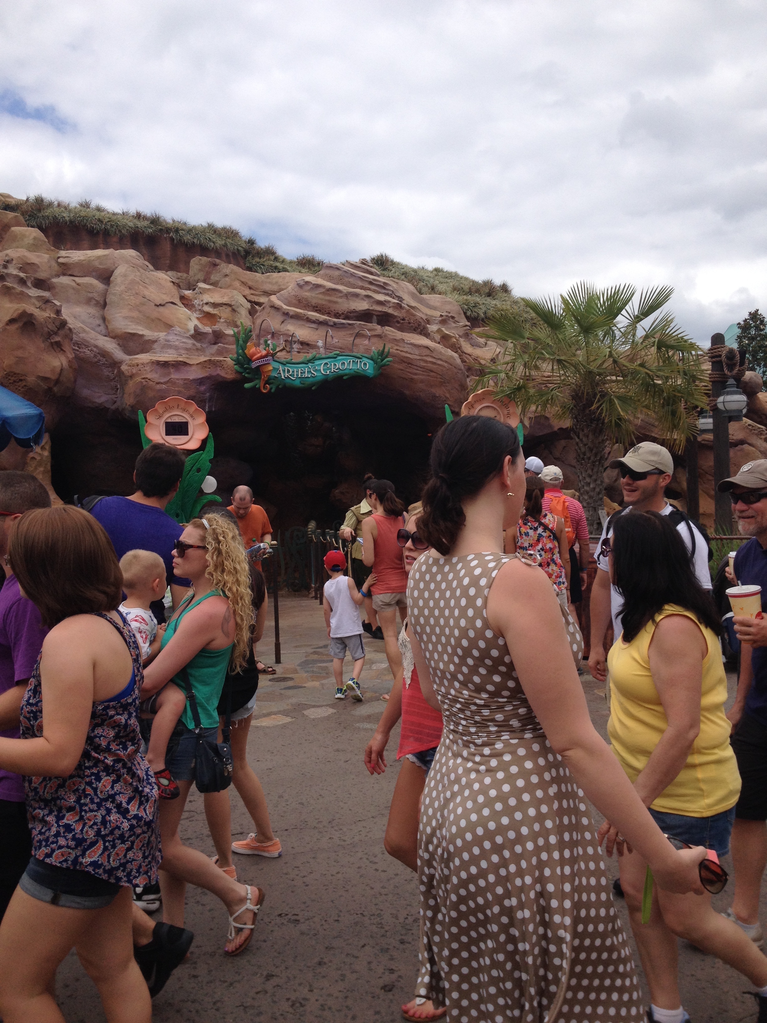 Para a Julia brincar, entramos na fila do brinquedo “The Magic Carpets of Aladdin” mas deu algum problema e a fila ficou parada um tempo. Com aquele sol e sem saber se voltaria rápido, optamos em sair e ir em outro brinquedo.