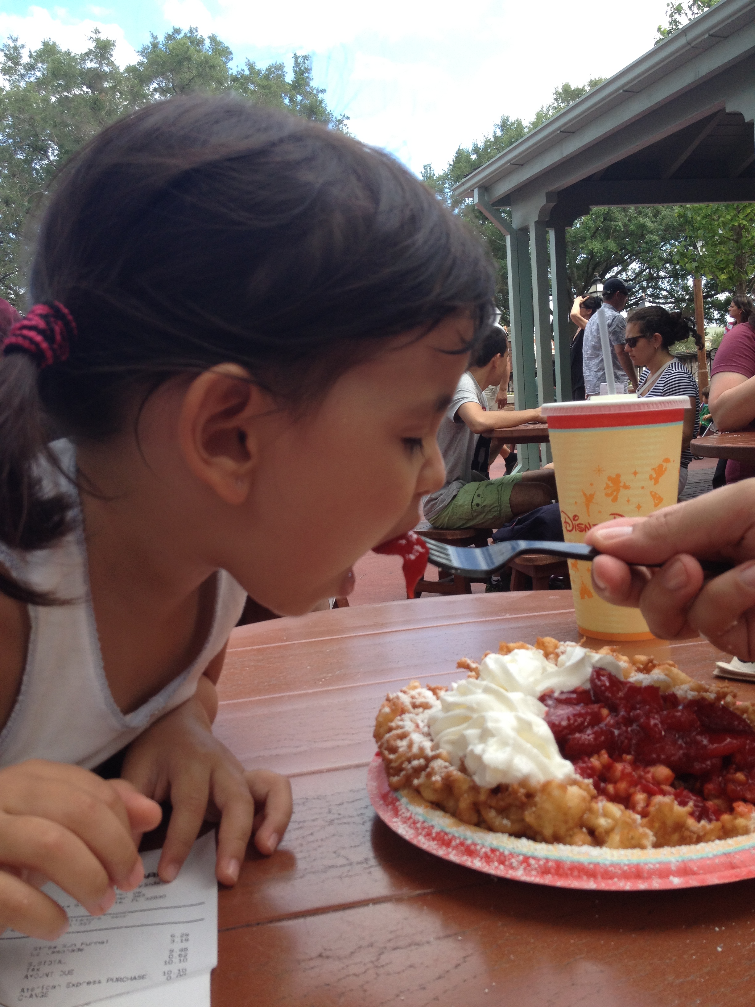 Devemos uma volta e paramos logo para almoçar! Lá tem uma área de restaurantes com algumas variedades. A Julia pediu arroz, feijão, carninha e batatinha…coitada! Só conseguimos pegar arroz em um restaurante chinês. Pelo menos ela comeu e gostou!
