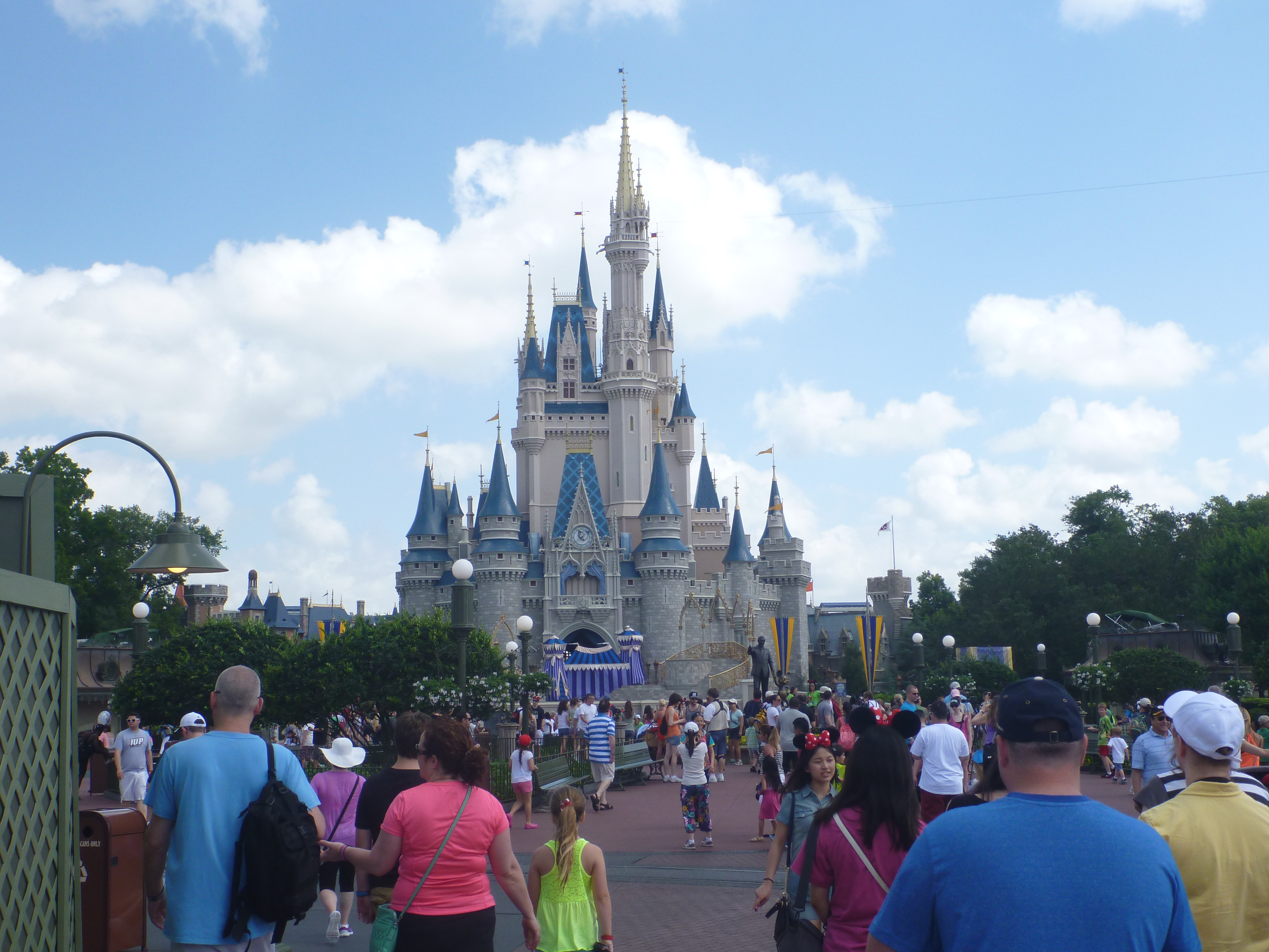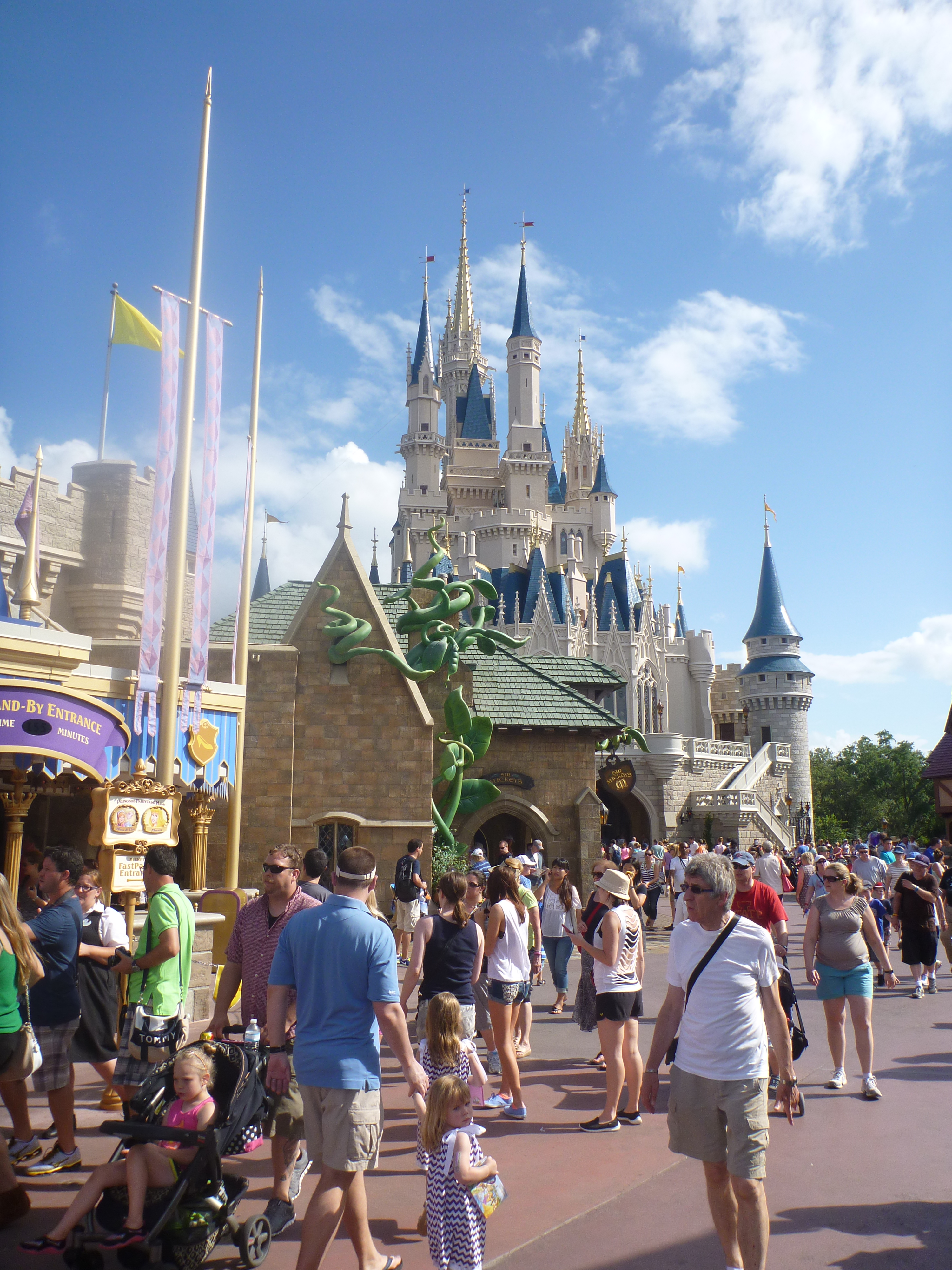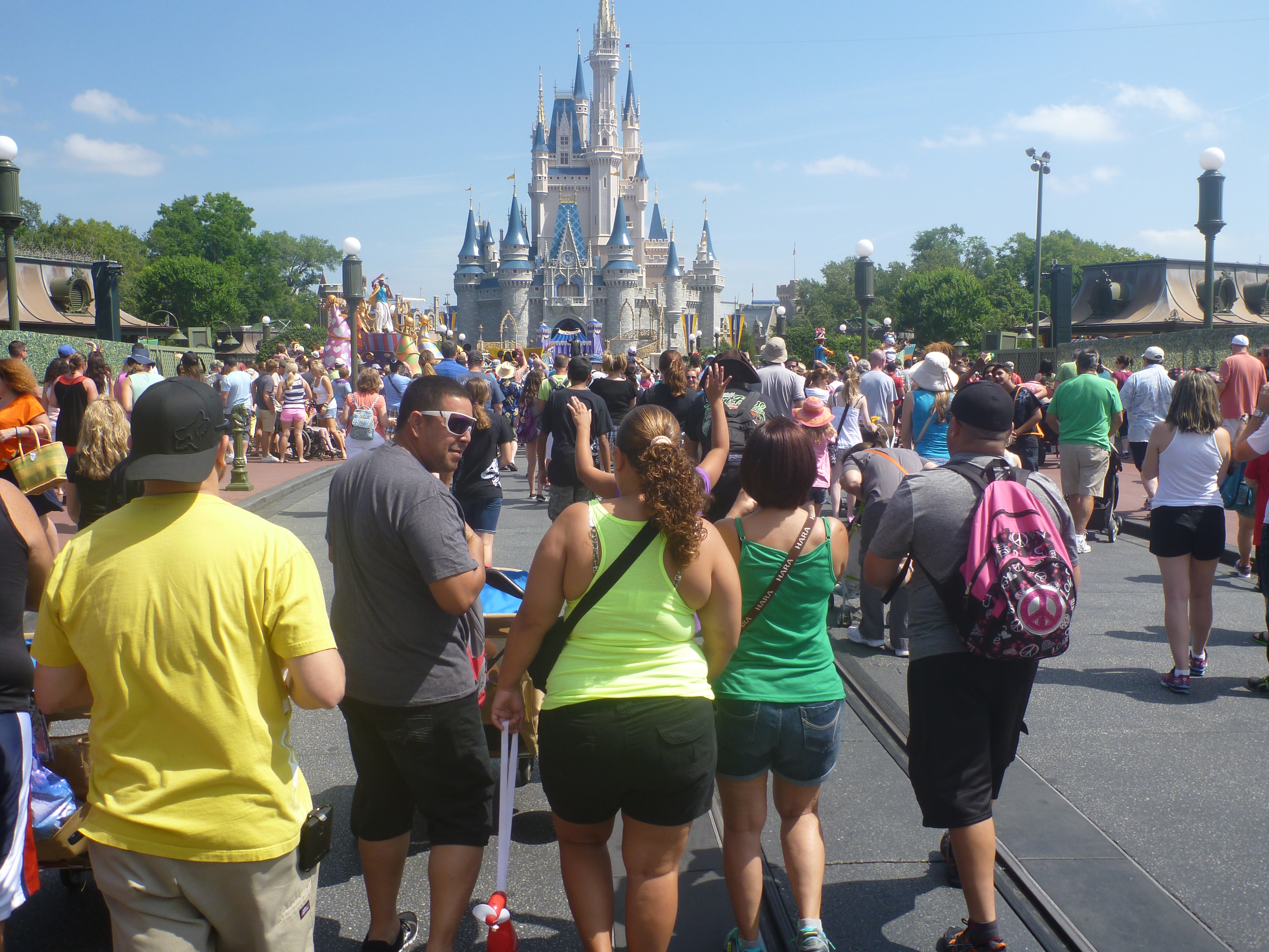 Depois de acompanharmos toda a parada, seguimos contornando o parque pelo lado esquerdo, sentido horário. A parte de trás do castelo é beeem movimentado, o fluxo de pessoas é grande e temos que ter muita paciência ao andar pelo parque, pois além da passagem de pessoas caminhando tem muitos carrinhos de criança, pessoas em cadeira de roda e outras que alugam um carrinho automático. Antes pensávamos que quem alugava esses carrinhos fossem pessoas com problema de locomoção mas vimos que existem jovens, pessoas de mais idade, muitos obesos e fica disponível para quem quiser. Como não procuramos por este meio de locomoção não temos noção de preço!