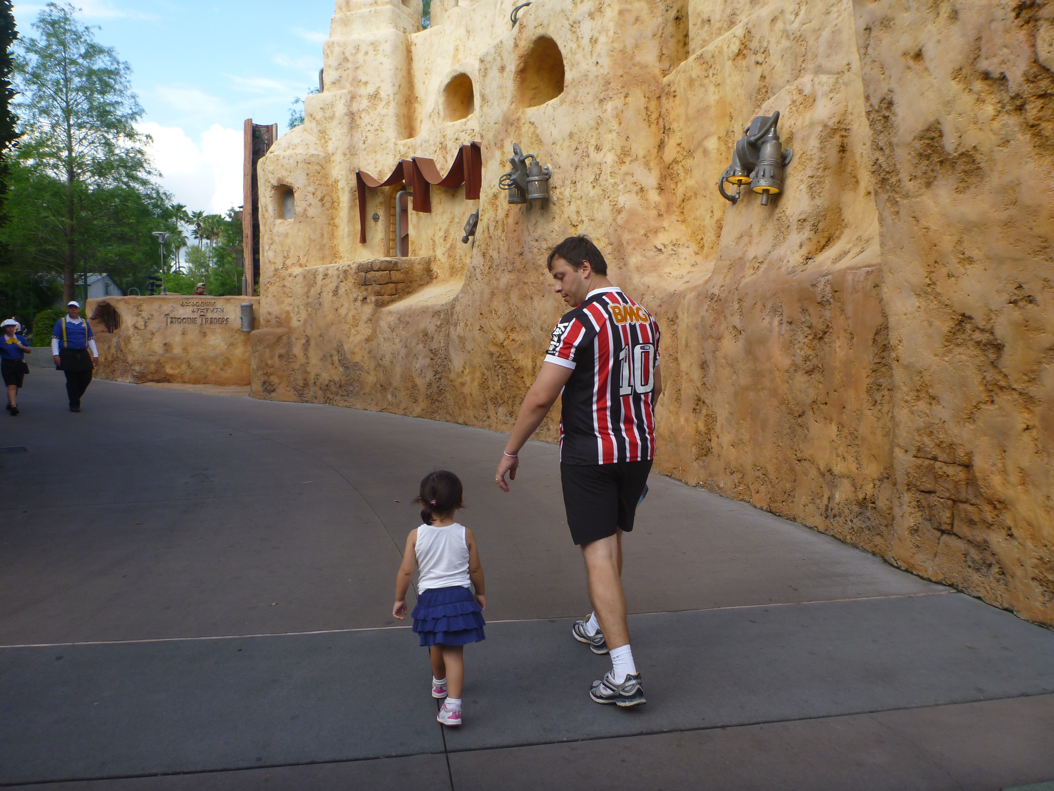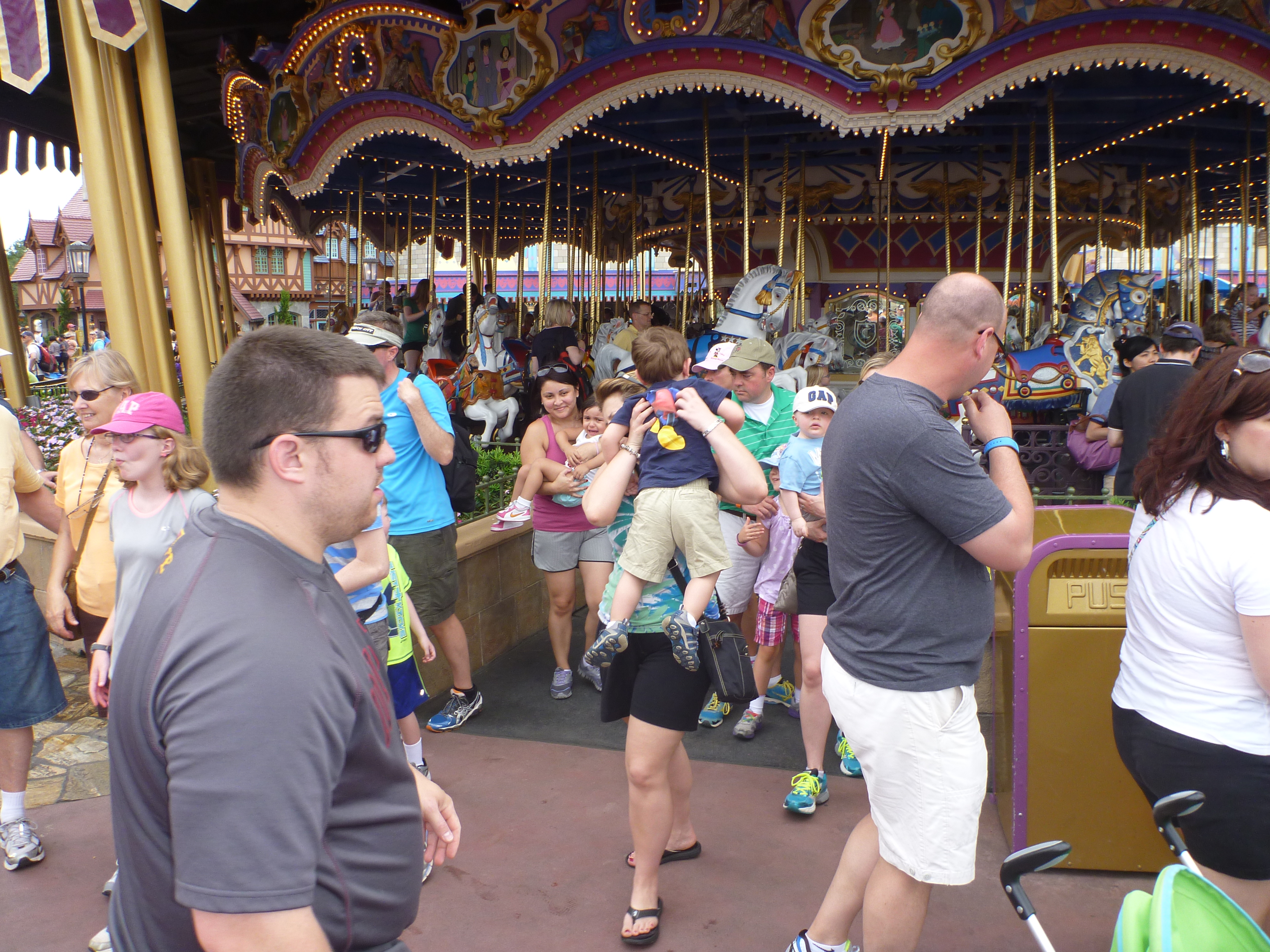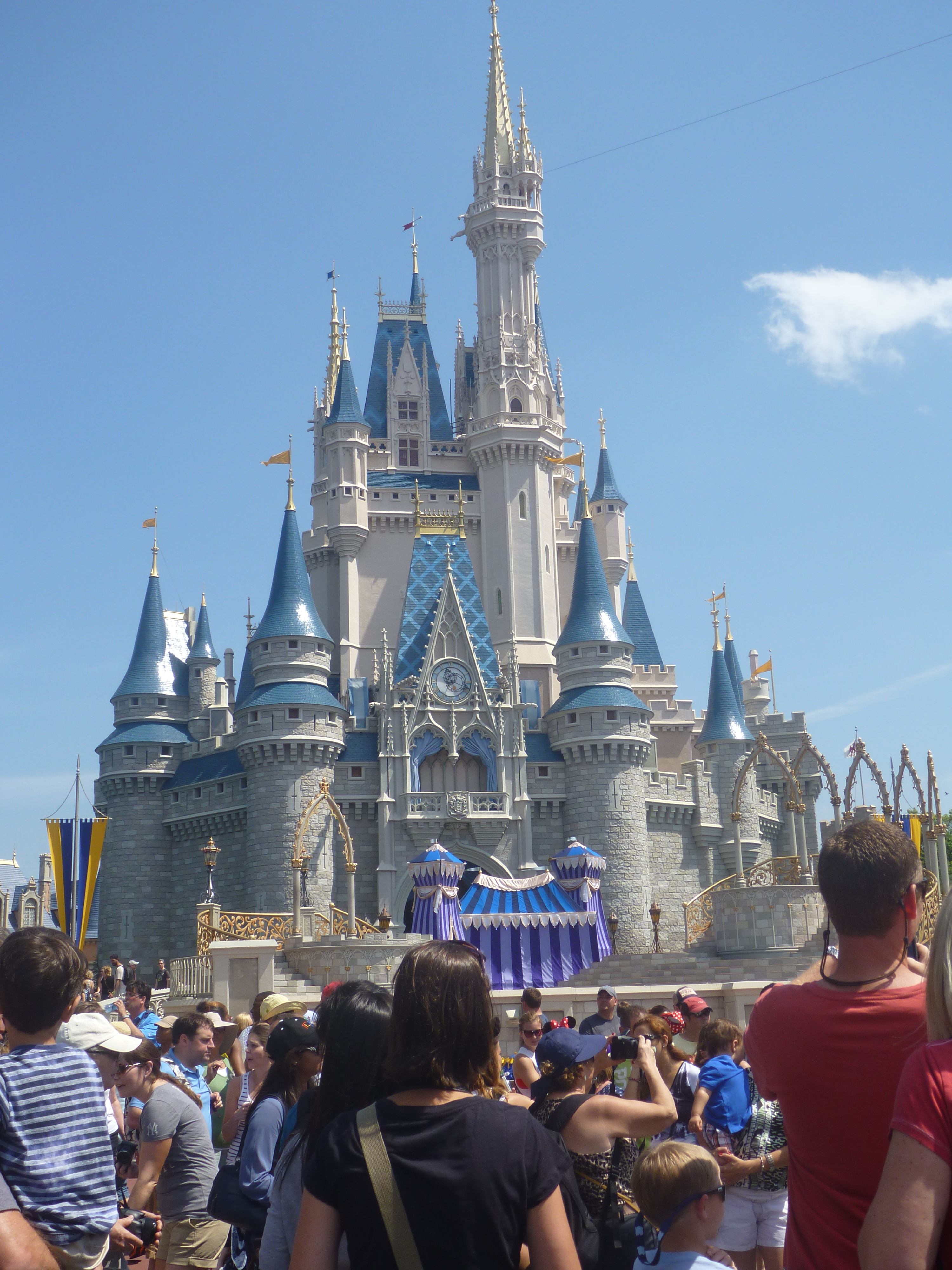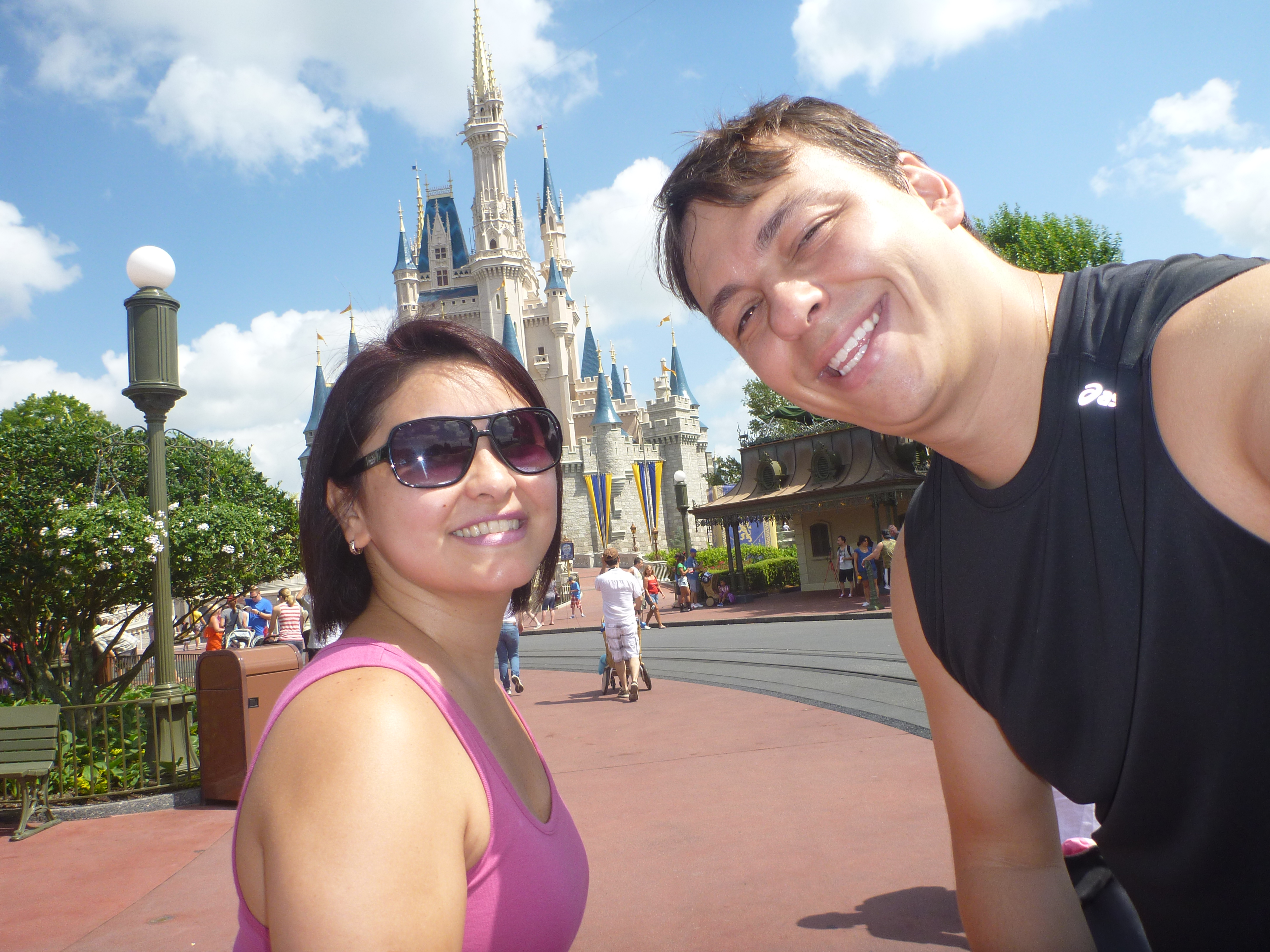 Depois de acompanharmos toda a parada, seguimos contornando o parque pelo lado esquerdo, sentido horário. A parte de trás do castelo é beeem movimentado, o fluxo de pessoas é grande e temos que ter muita paciência ao andar pelo parque, pois além da passagem de pessoas caminhando tem muitos carrinhos de criança, pessoas em cadeira de roda e outras que alugam um carrinho automático. Antes pensávamos que quem alugava esses carrinhos fossem pessoas com problema de locomoção mas vimos que existem jovens, pessoas de mais idade, muitos obesos e fica disponível para quem quiser. Como não procuramos por este meio de locomoção não temos noção de preço!