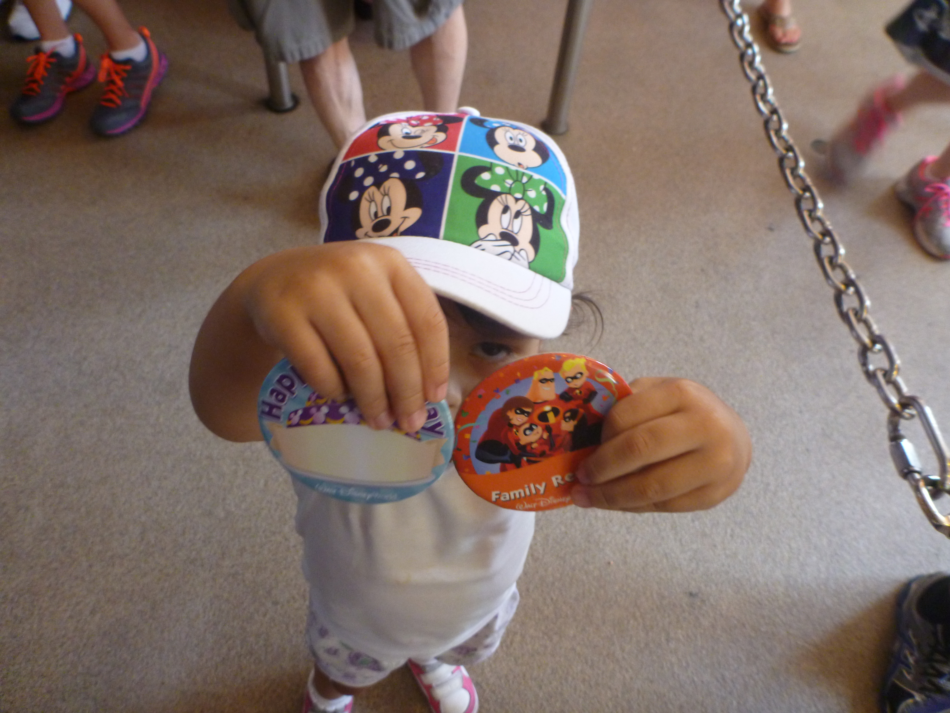 Outra dica é, ao entrar no parque ao lado esquerdo, vá até um carrinho que está parado e pegue alguns botons dos personagens. Nós pegamos para a Julia de aniversário, que será daqui menos de 2 meses e também de primeira visita ao parque.