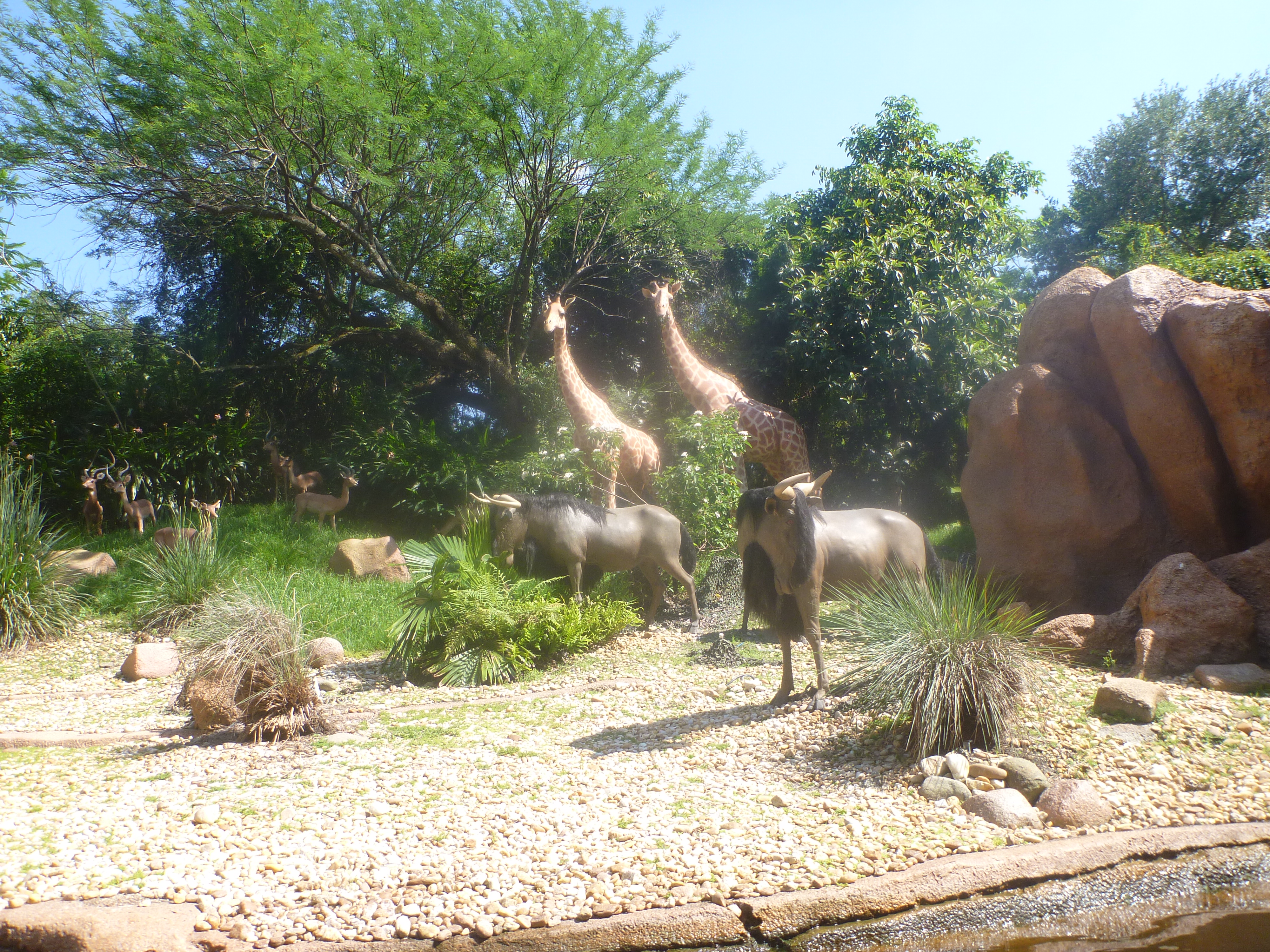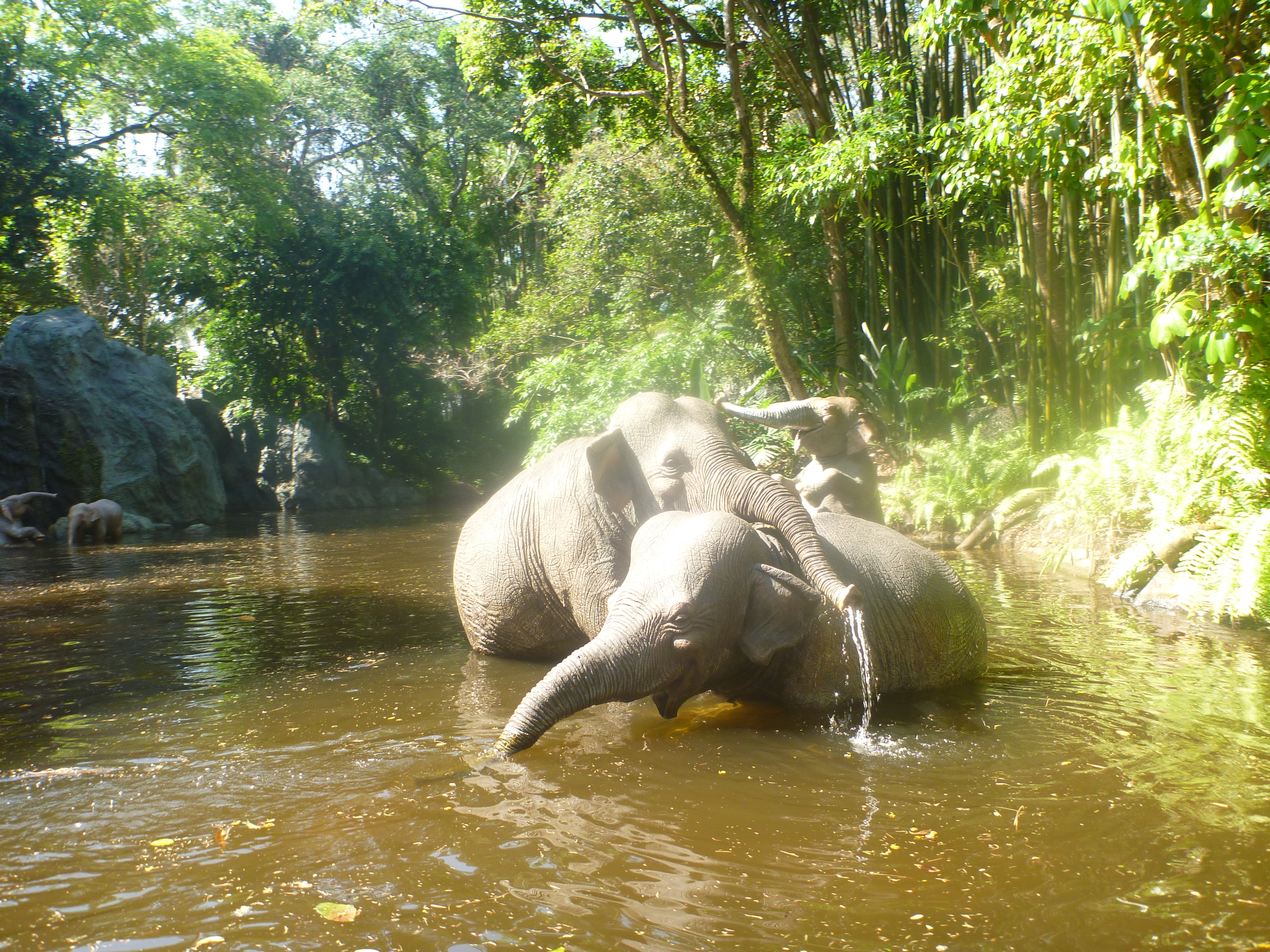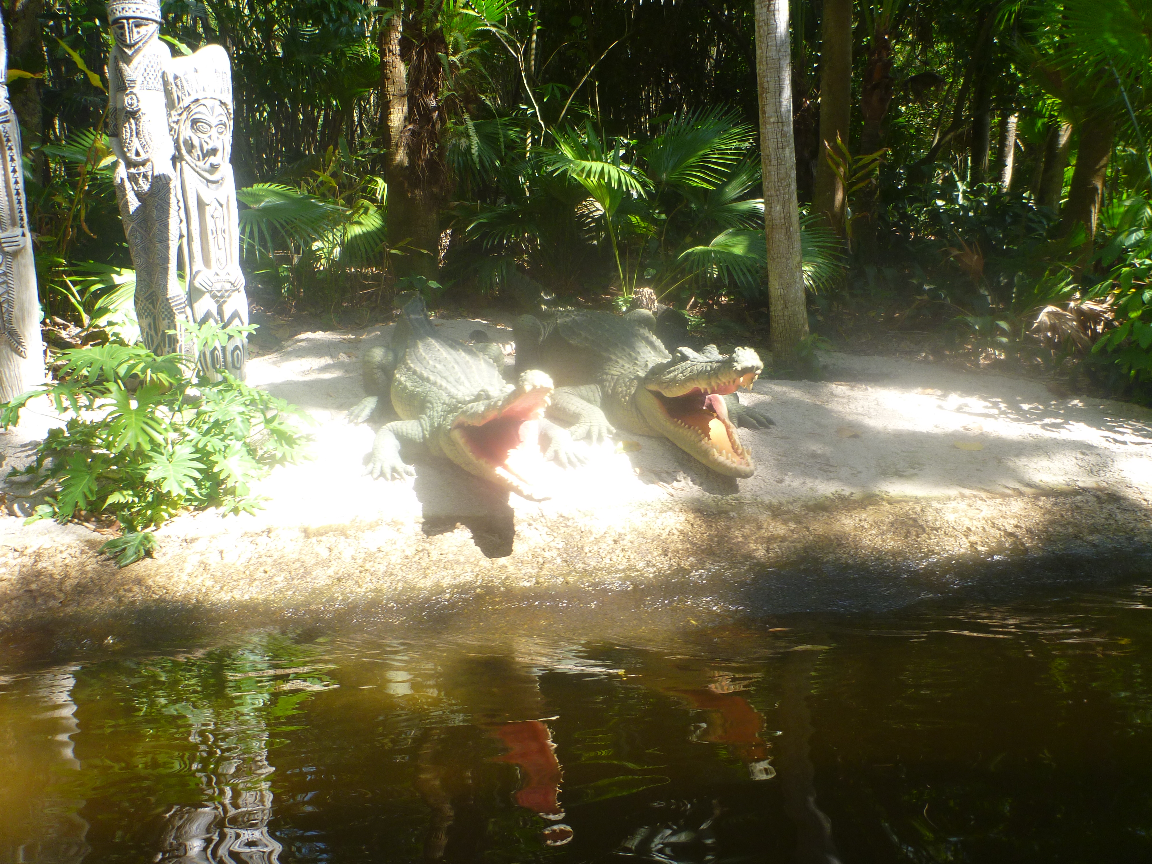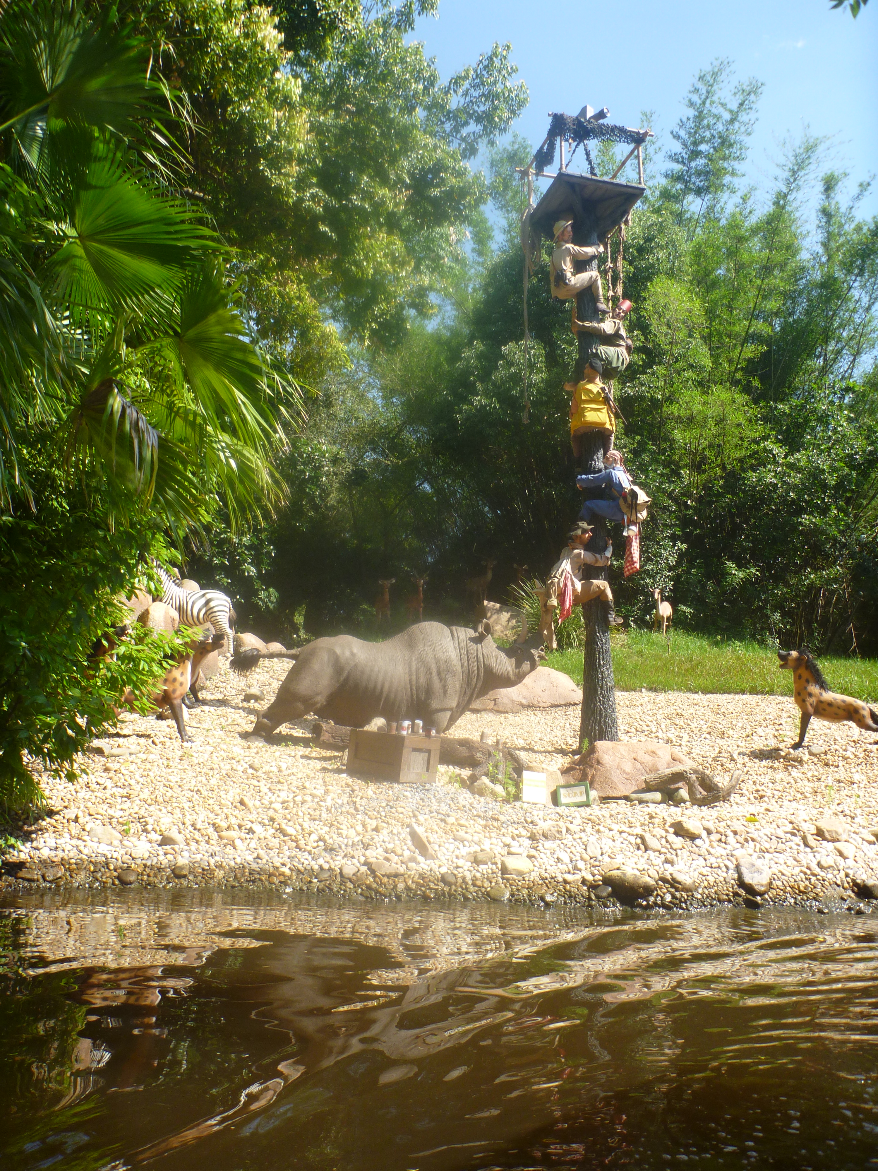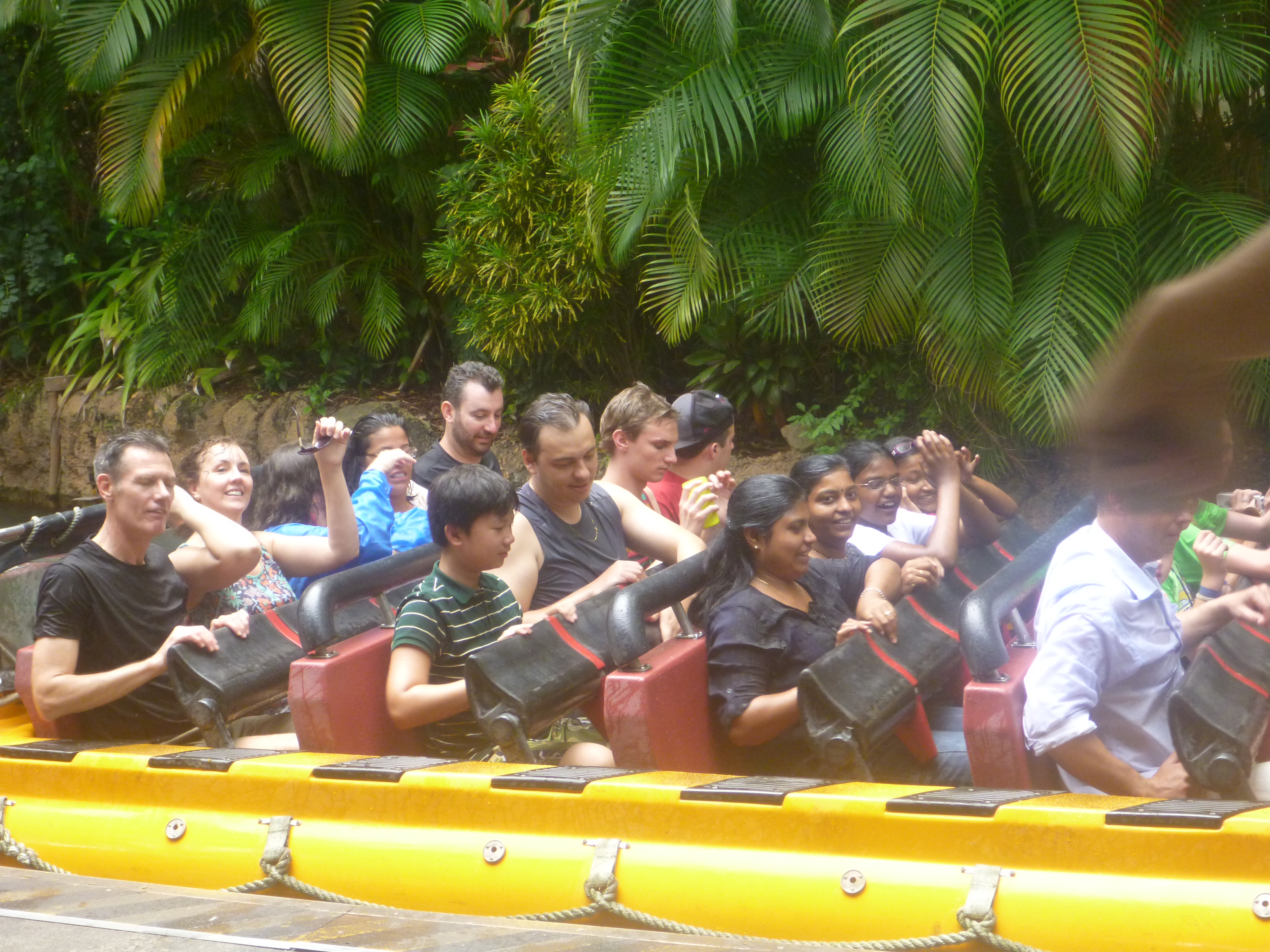 Entramos em um barco e percorremos toda a selva. Vimos réplicas de animais como elefantes, macacos, rinocerontes, girafas, jacarés que se movimentavam perfeitamente na água. Show!!