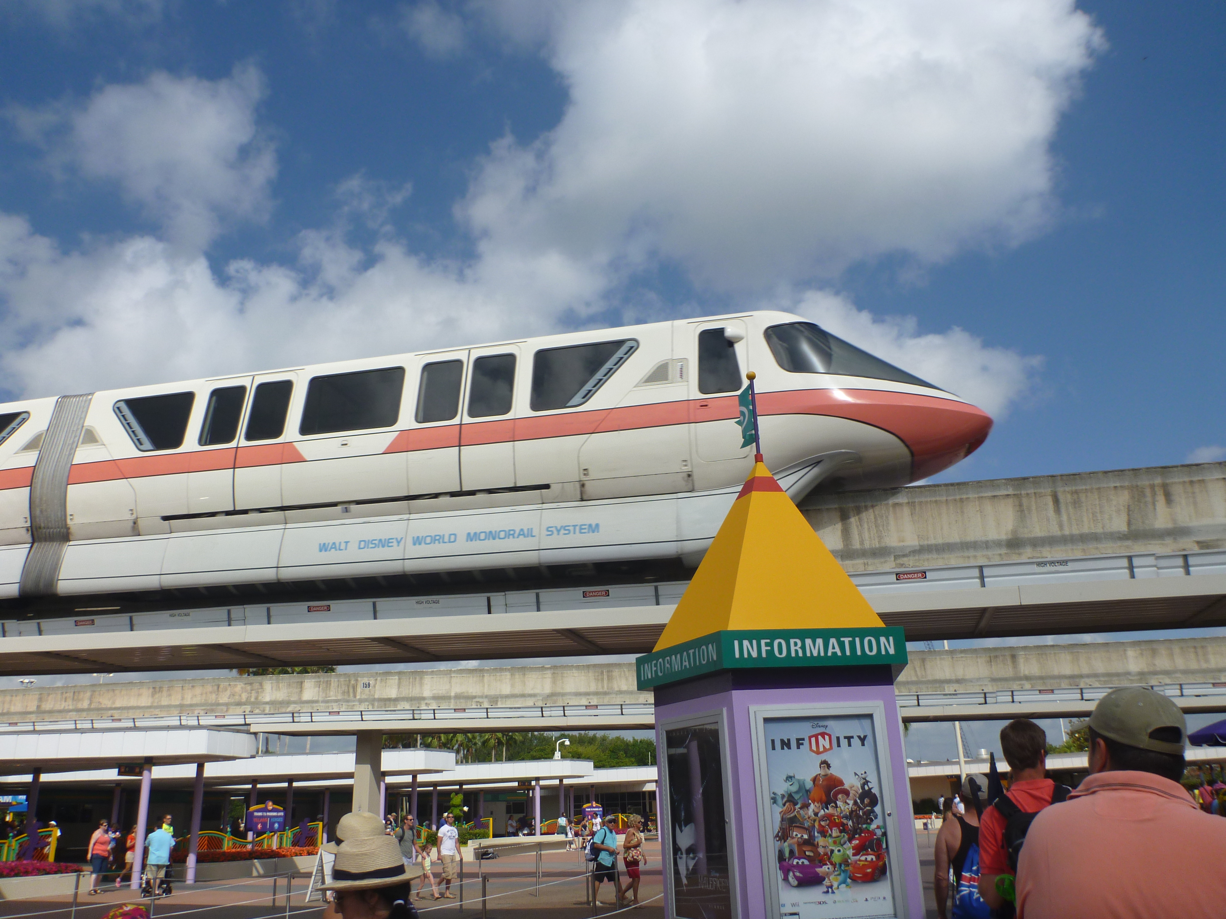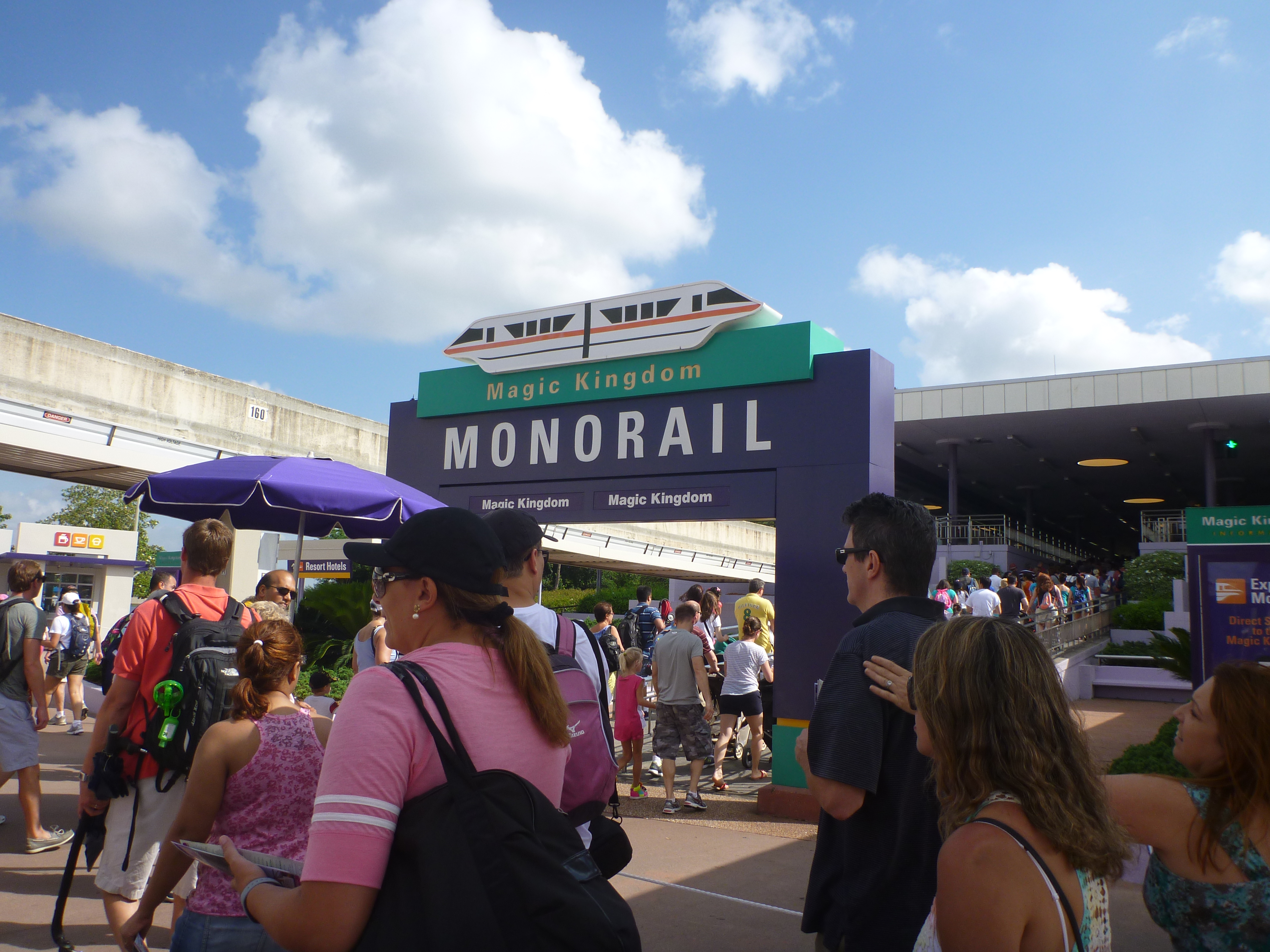 Para entrar no parque desta vez fomos a pé, não pegamos o carrinho que leva até a primeira entrada. De lá optamos em pegar o Monorail e o caminho que ele faz dá para ver um dos hotéis que fica dentro do parque. Show!