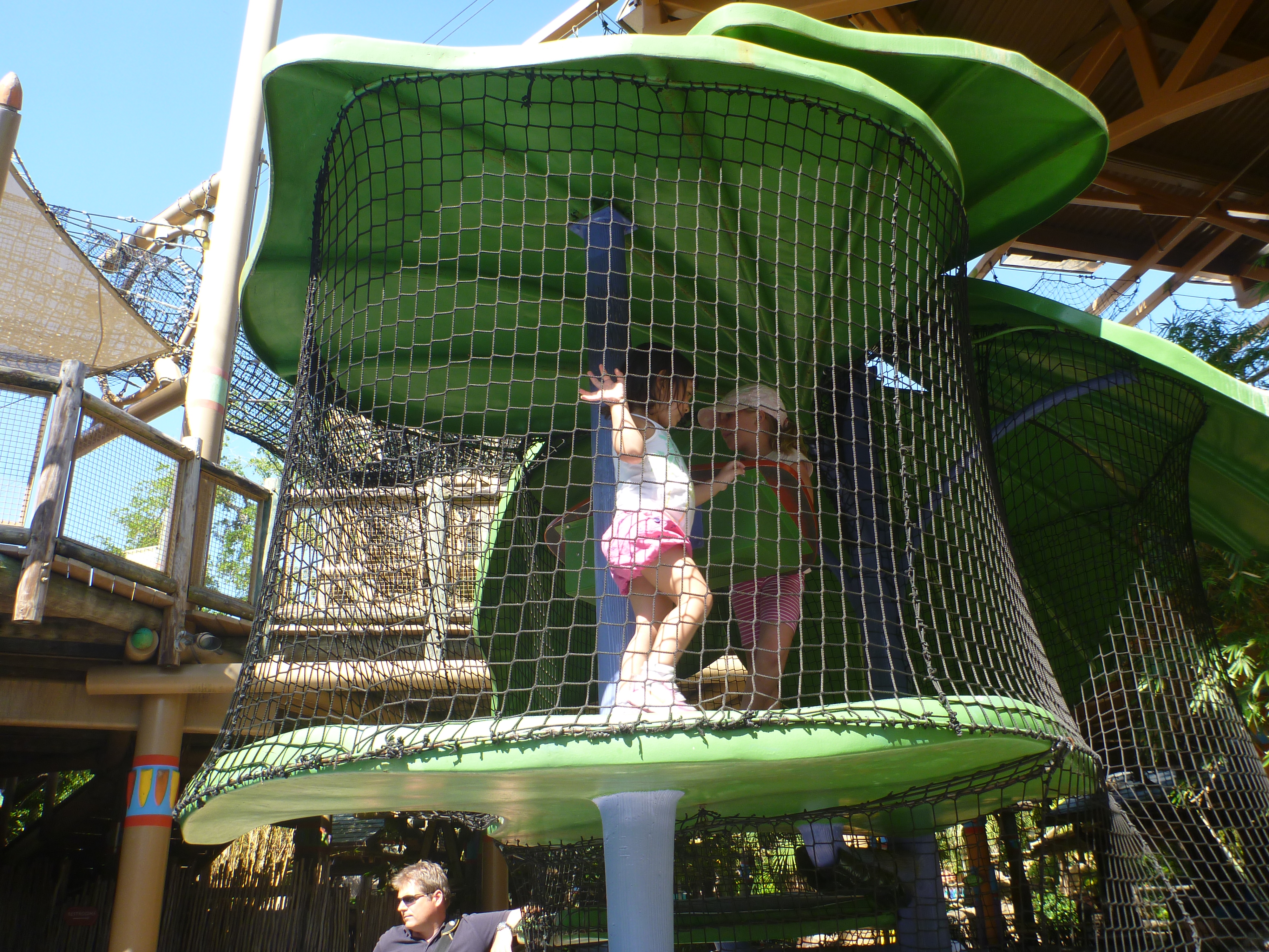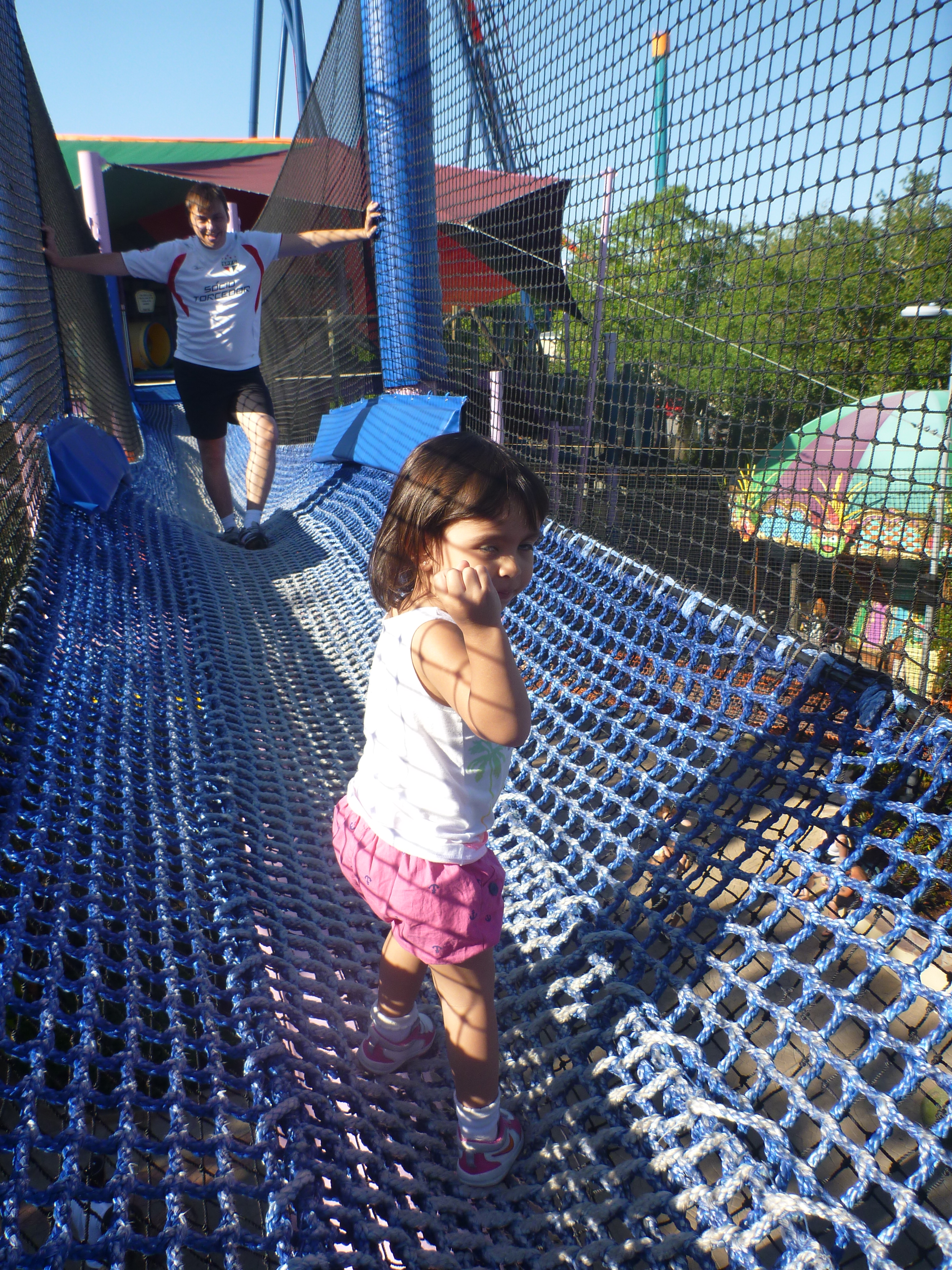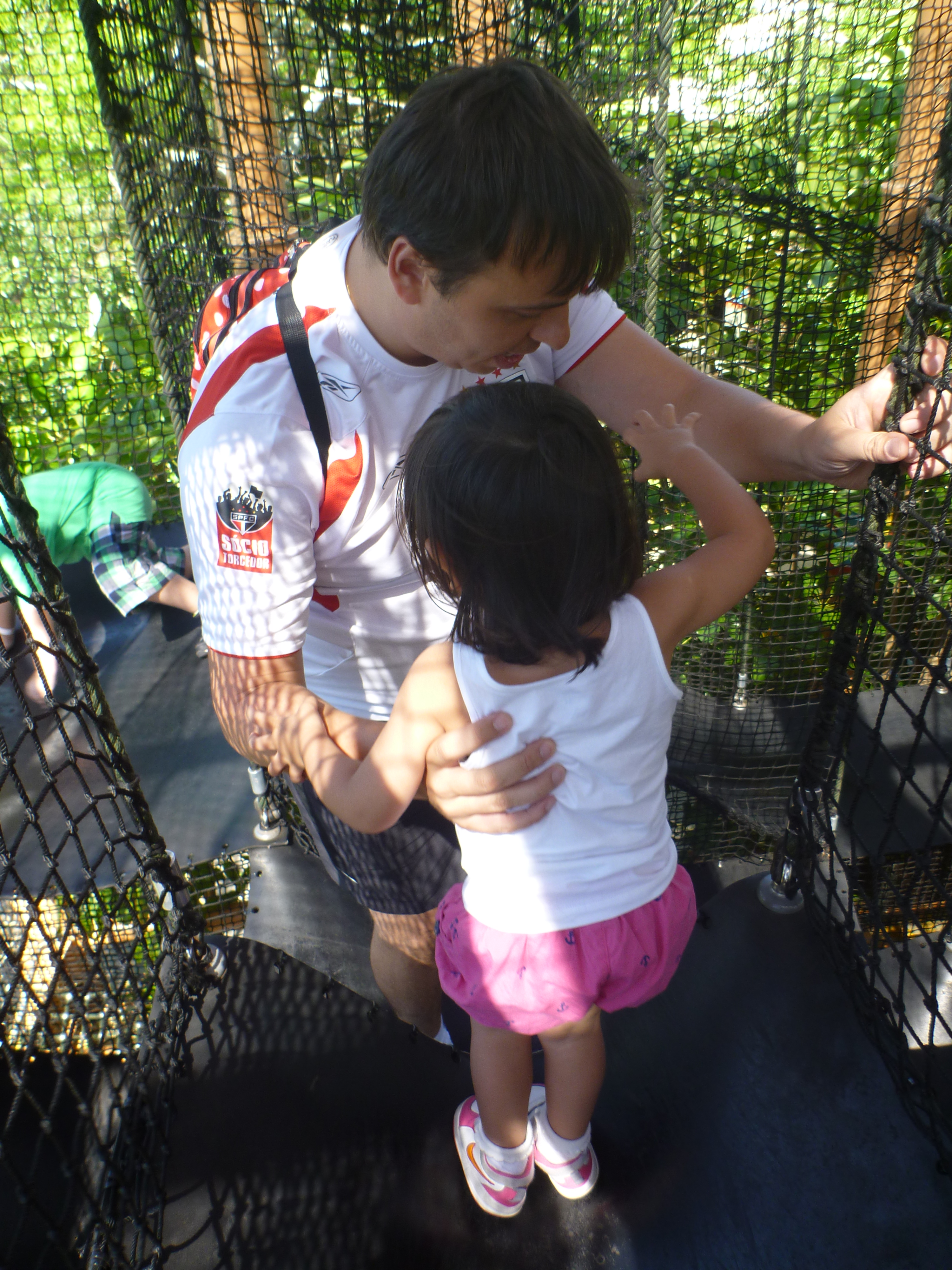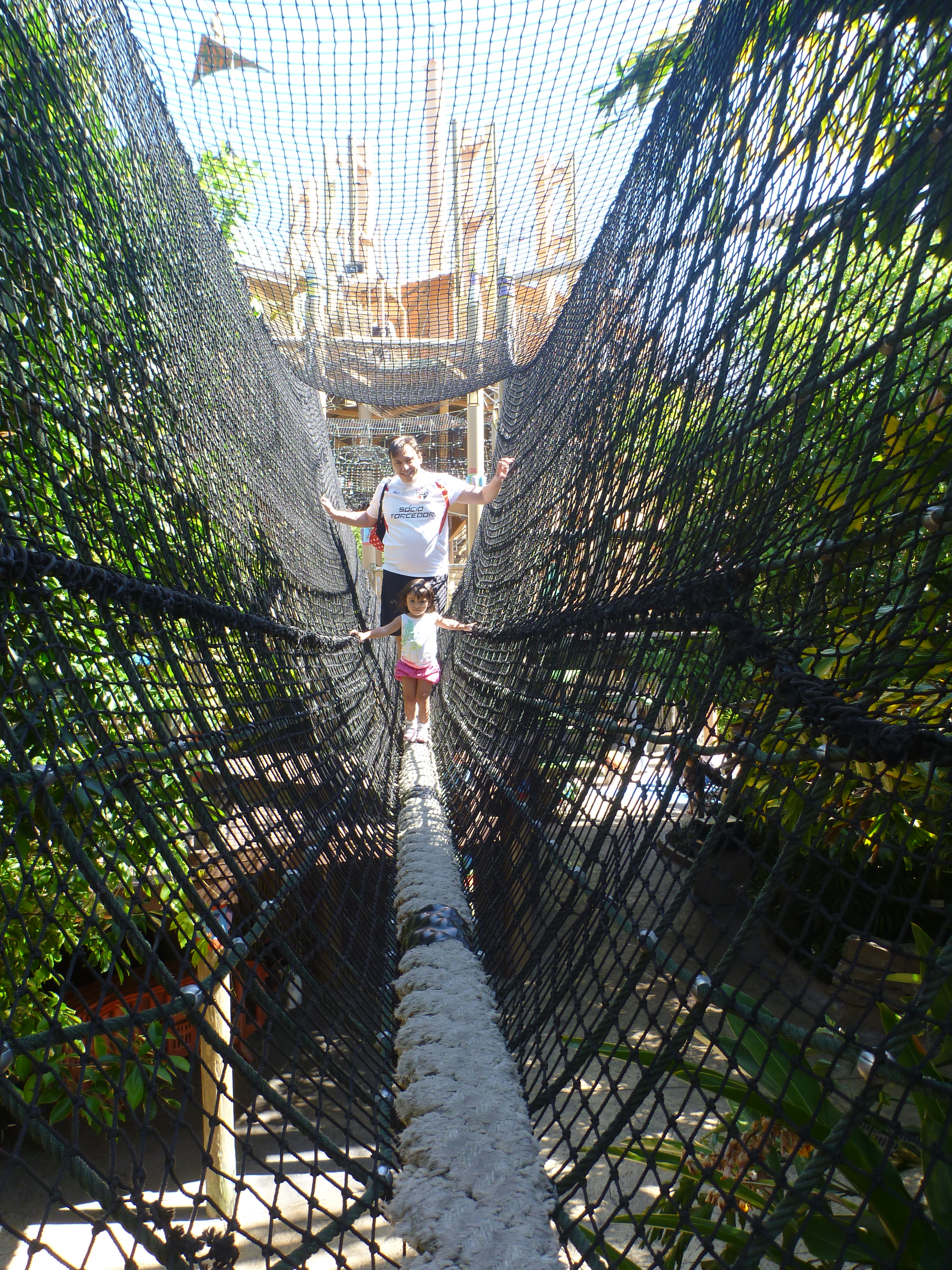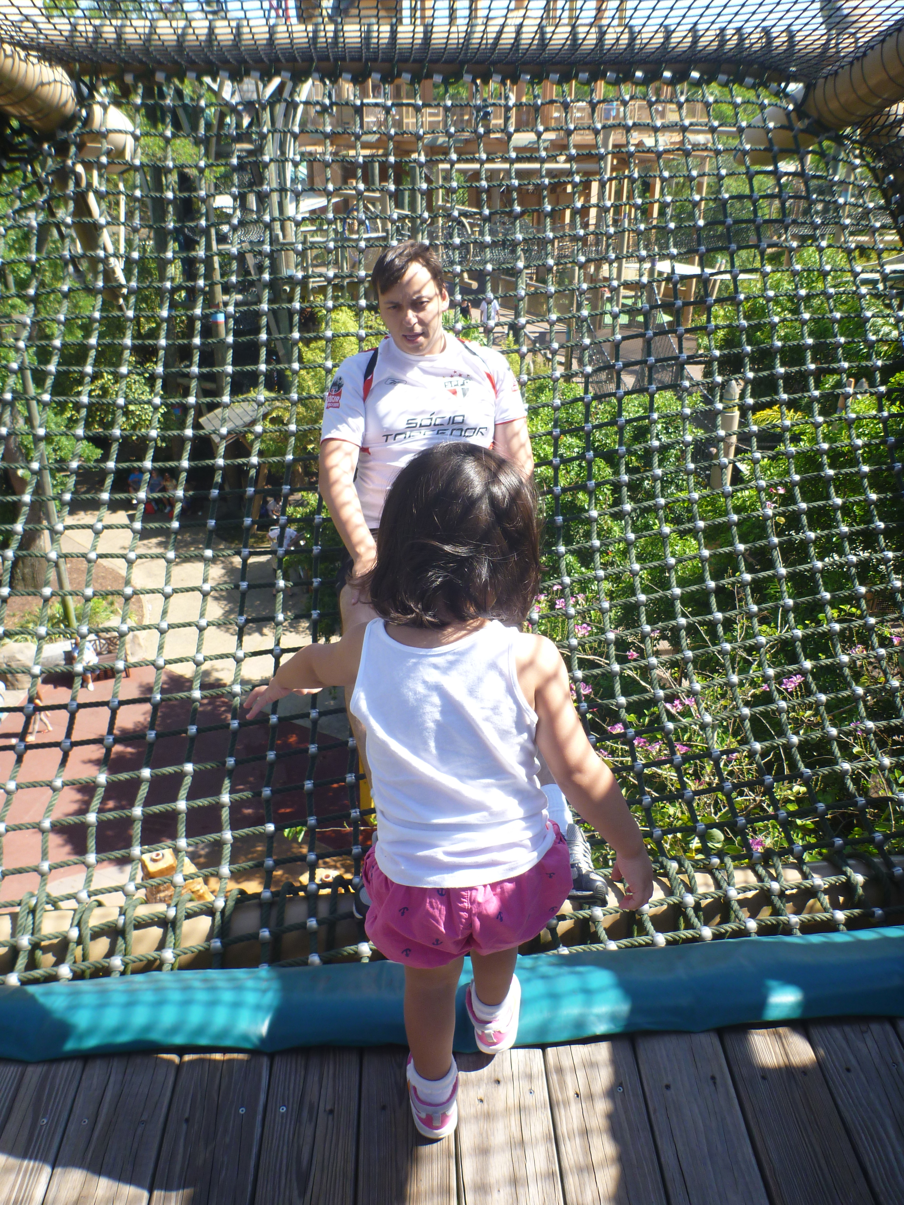 De lá, achamos uma atração pra Jú. É uma atração em uma casa na árvore com várias ligações para cruzar de um lado pro outro.