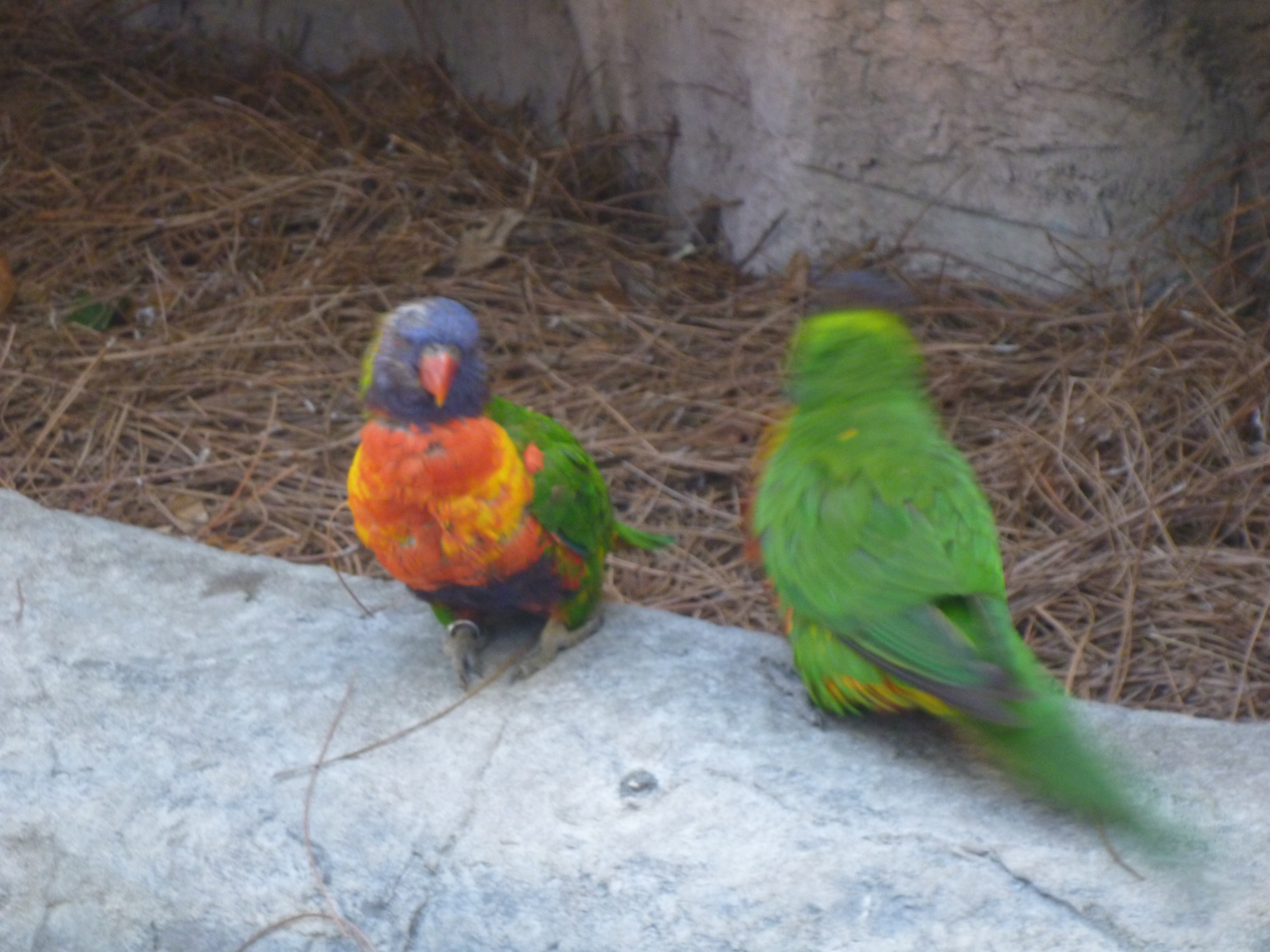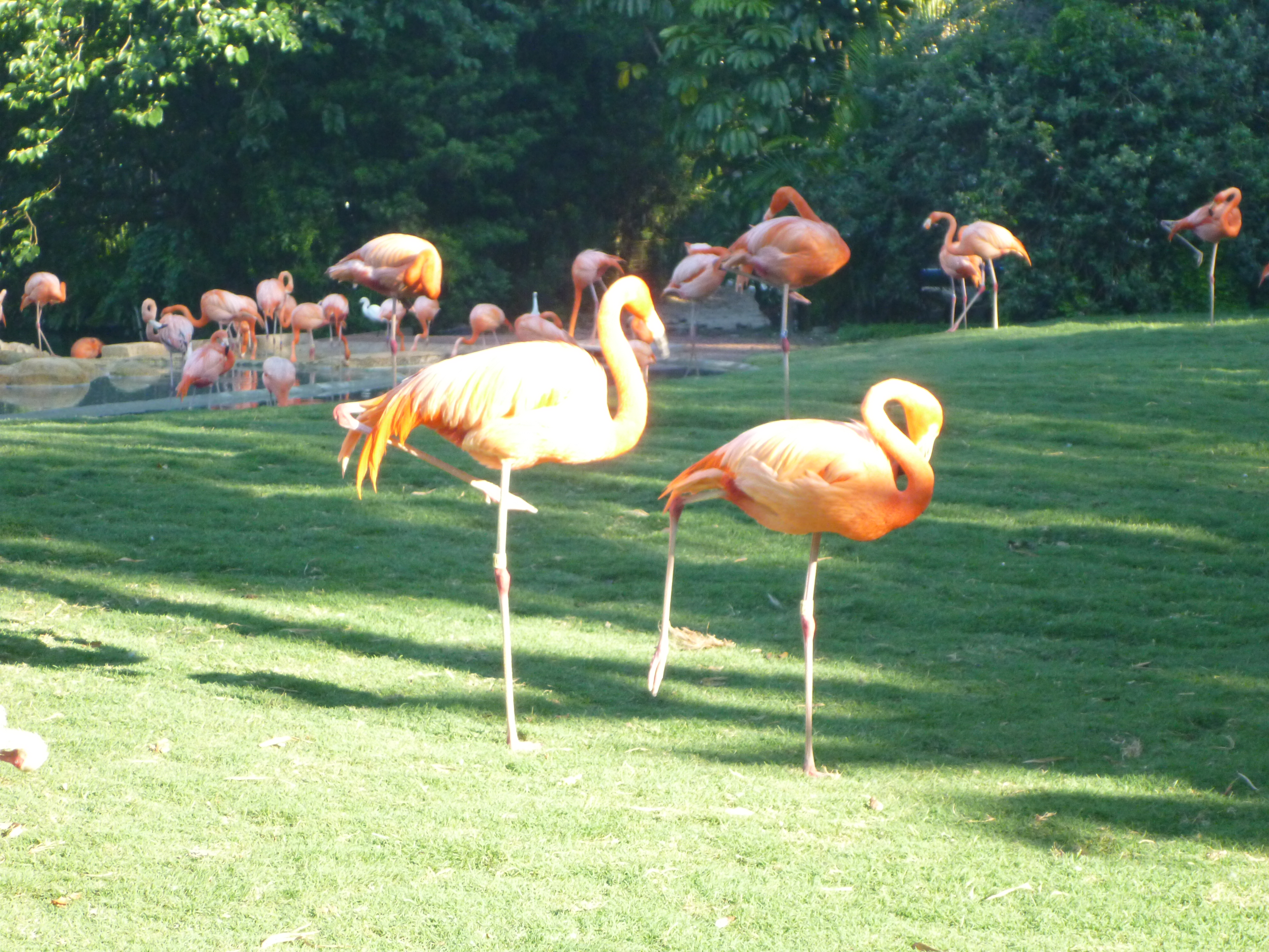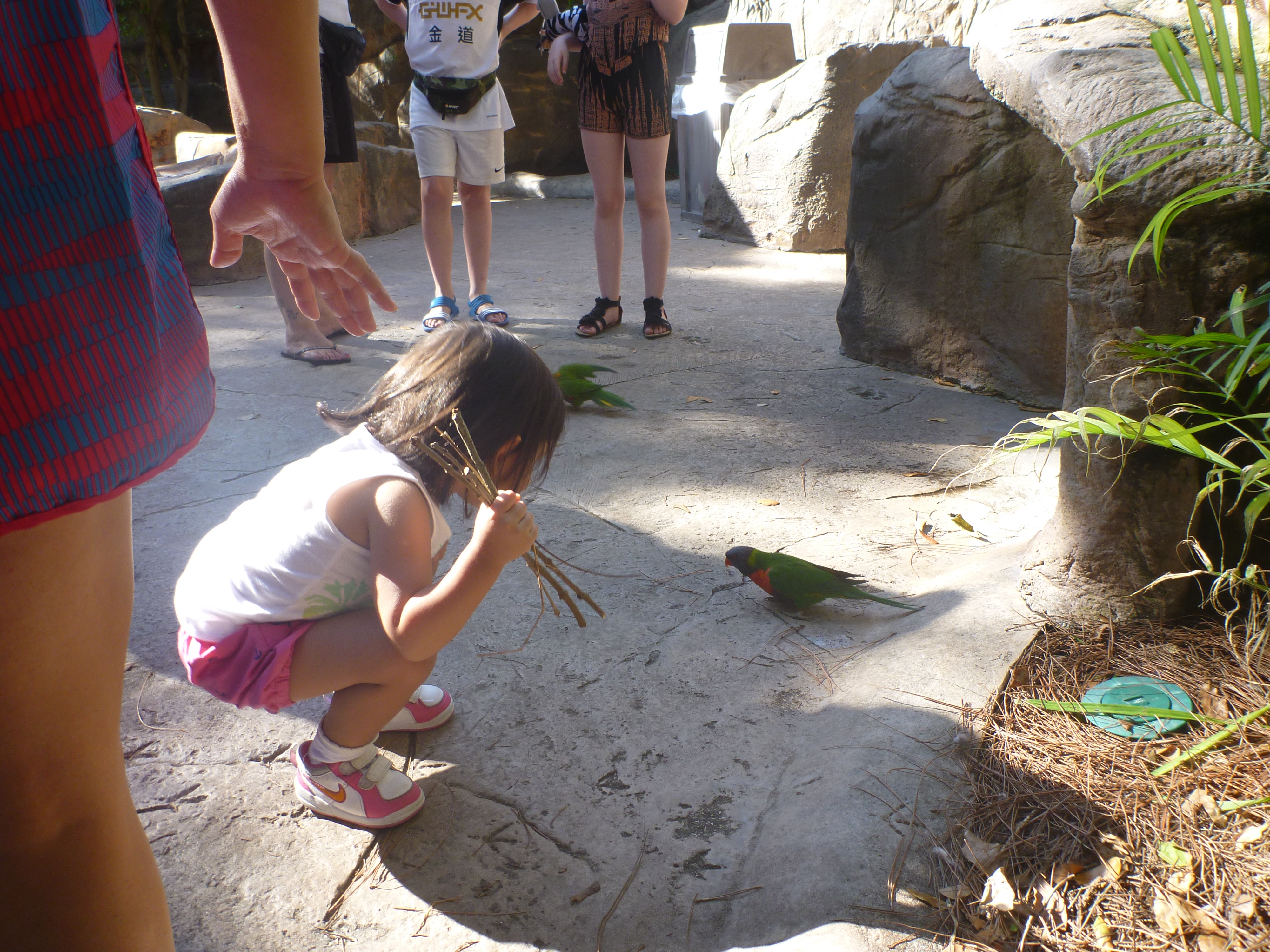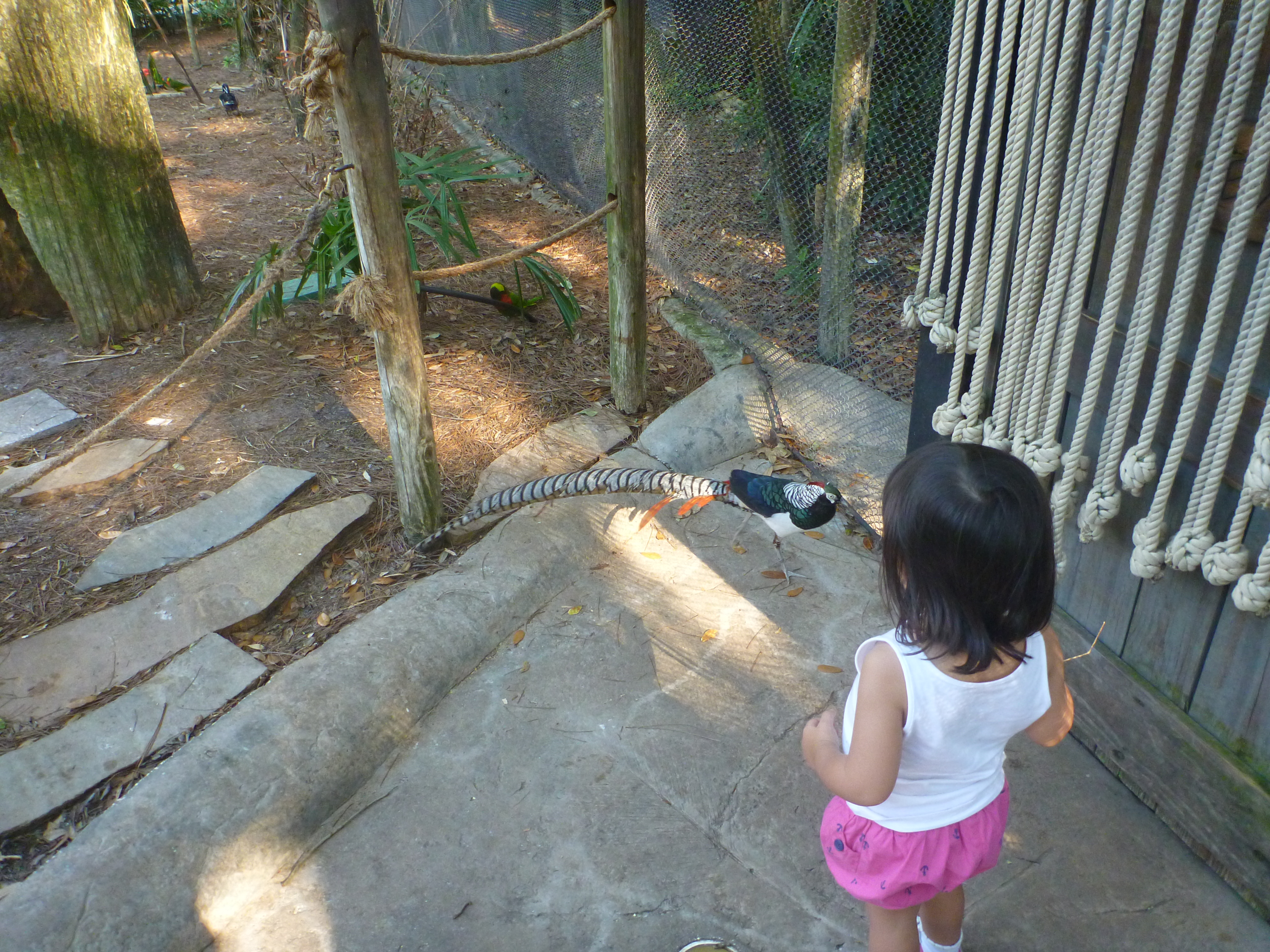 Temos que passar por uma porta cheia de cordões e na parte de dentro os pássaros ficam todos soltos. Caminhamos e vimos vários andando e pulando no chão. Eles nem ligam com a presença das pessoas e crianças!